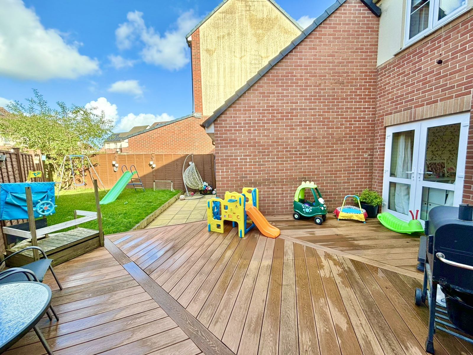 To the rear the garden is easily maintained with a large decked terrace area having access from both the kitchen/ diner and lounge. There is a further large paved patio area and also a raised lawn. Secure and enclosed with fencing the garden is a great space to enjoy outdoor living.