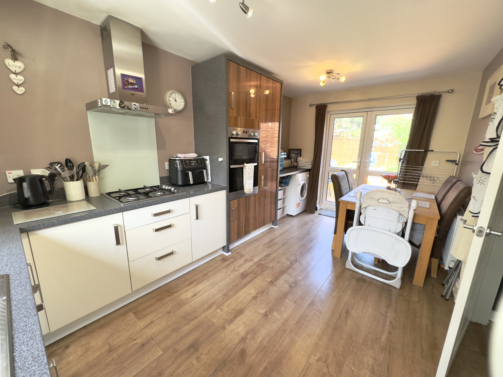 Kitchen / DinerUPVC double-glazed window to front elevation and UPVC double-glazed doors giving access to the garden. Modern and bright kitchen with excellent range of base and eye level fitted units and drawers with integrated fridge/ freezer and dishwasher. Four ring gas hob with chimney style extractor over. Zanussi eye level double oven and space for washing machine and tumble dryer. 1 1/2 bowl stainless steel sink and drainer with mixer tap. Two ceiling lights and range of power points. Extractor fan and radiator with wood effect flooring throughout.