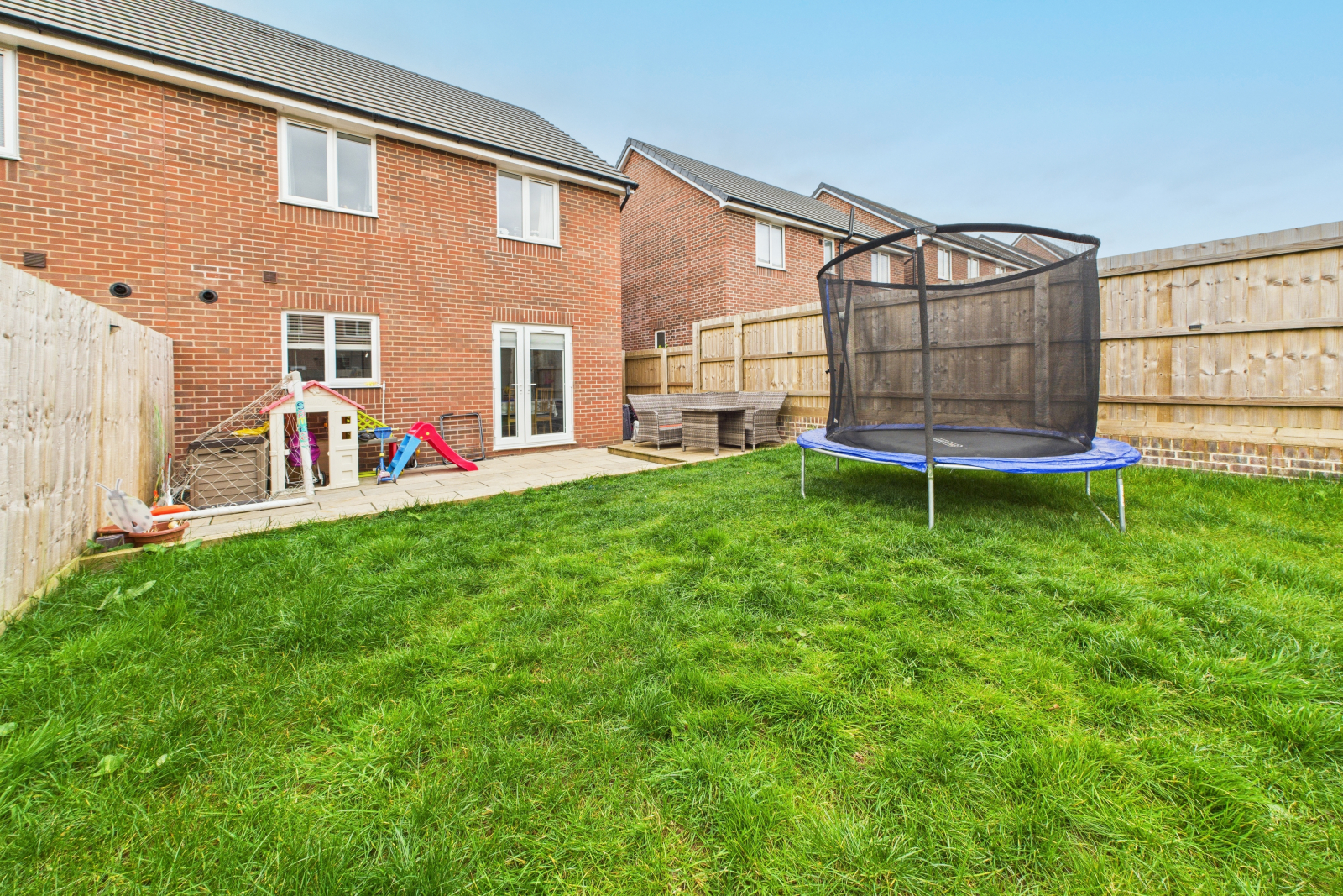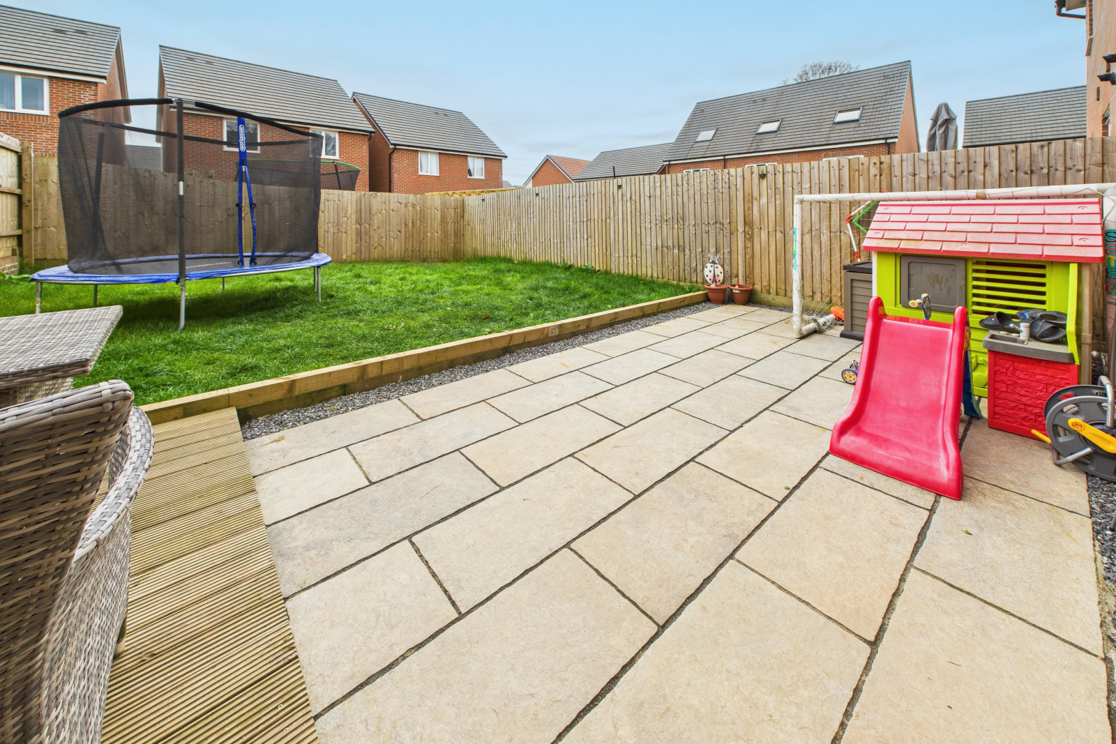 This beautiful home combines modern living with family-friendly spaces. A spacious driveway leads to a charming entrance porch. Inside, the light-filled layout includes a cosy lounge and a contemporary kitchen/diner opening to the garden. Upstairs, the master bedroom features lots of natural light and an en-suite, with two additional good-sized bedrooms and a modern family bathroom. The beautiful and large rear garden is landscaped with a lovely patio and decking area to enjoy outdoor living. Conveniently located near amenities, this home offers the perfect blend of comfort and style.