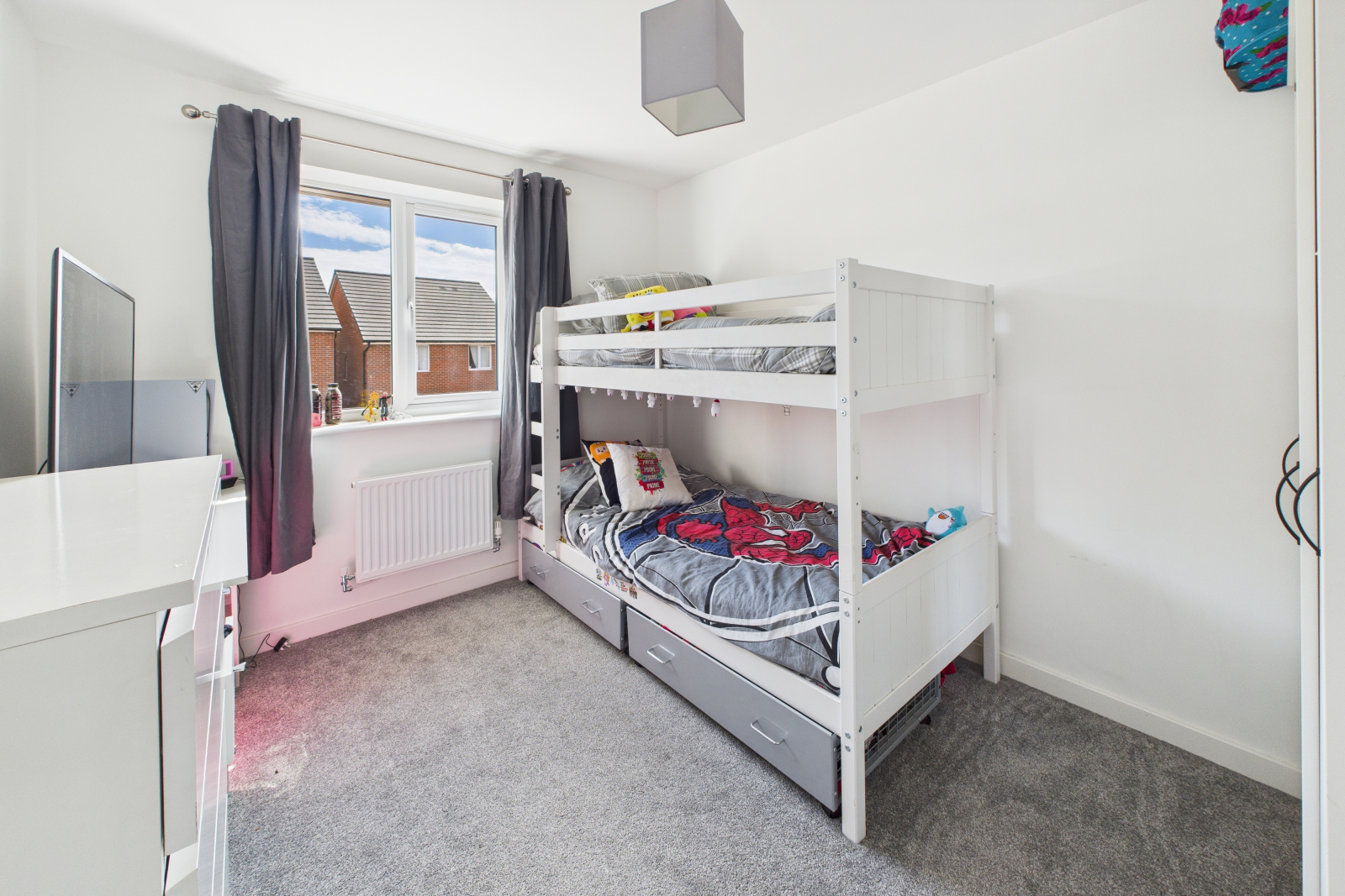 This rear-facing bedroom includes a UPVC double-glazed window, carpeted flooring, and central pendant lighting. A radiator and power points add to the room's comfort.