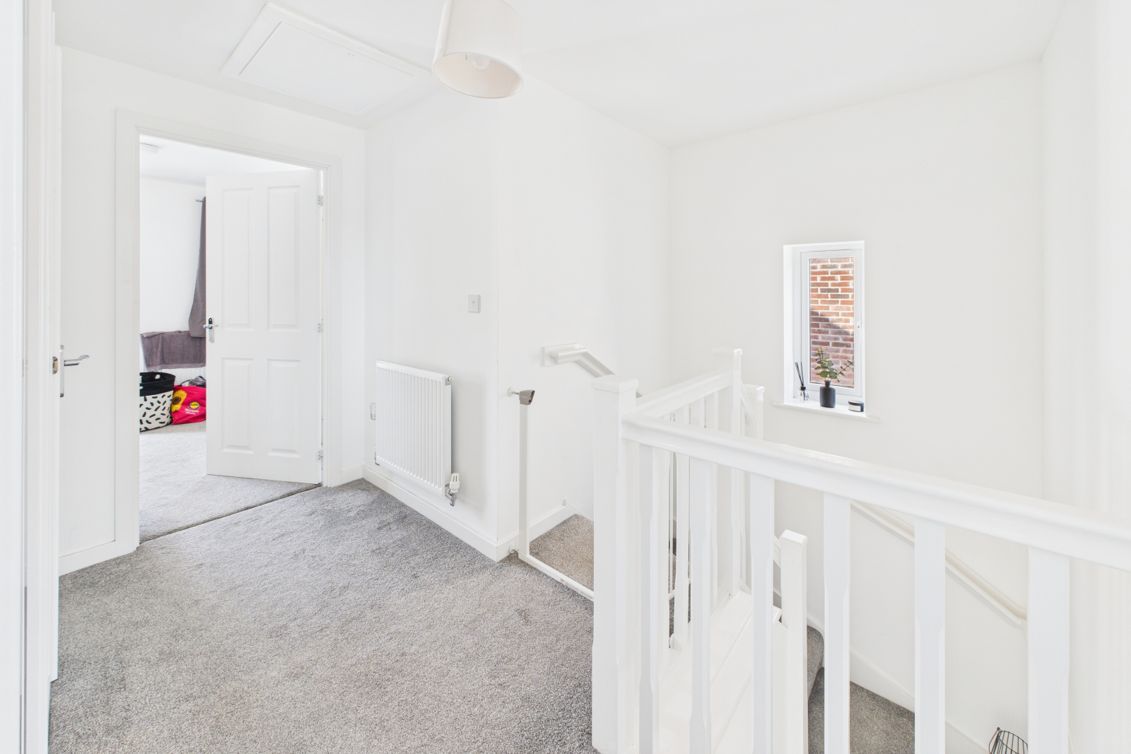 The spacious, carpeted gallery-style landing is brightened by a UPVC double-glazed window to the side. Pendant lighting and a radiator are included, with doors leading to the bedrooms and family bathroom. A lift provides access to the upper level.