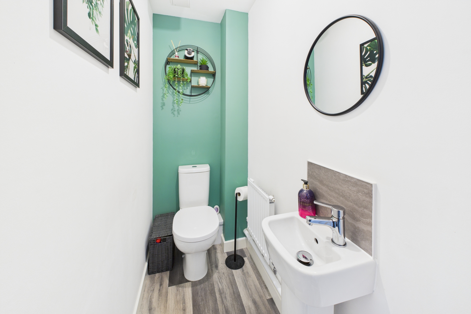 This convenient cloakroom offers a low-level push-button W.C and a pedestal wash hand basin with a mixer tap and tiled splashback. With wood-effect vinyl flooring, a radiator, and central lighting, it also benefits from an extractor fan.