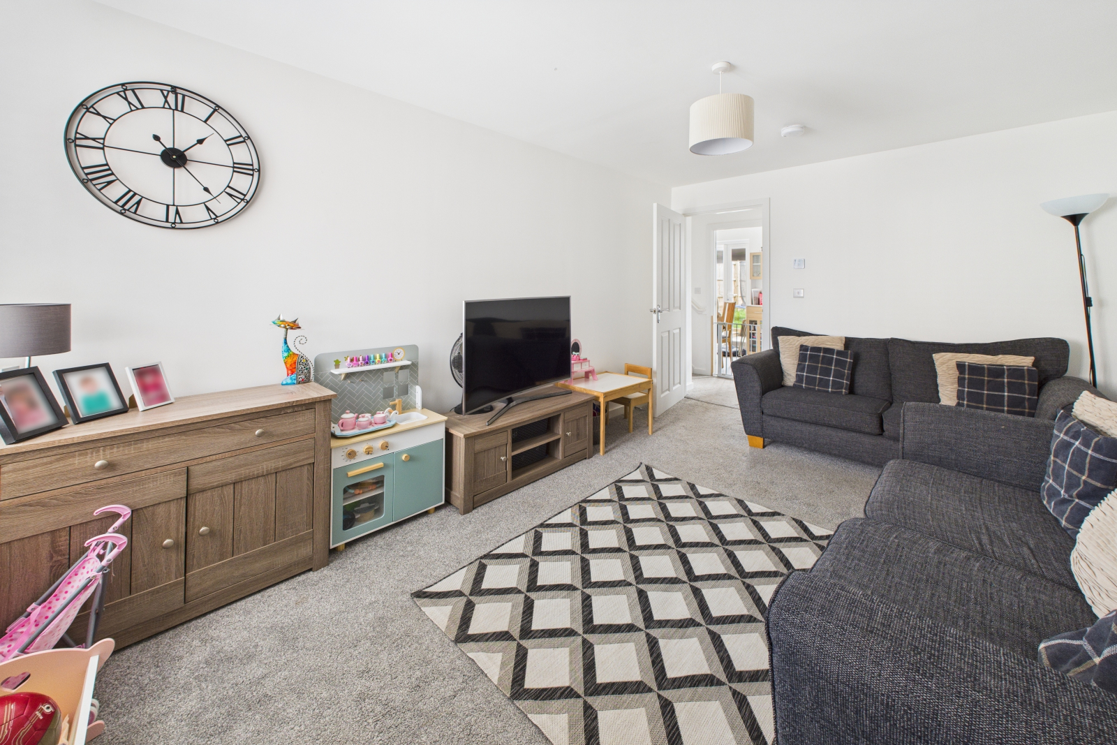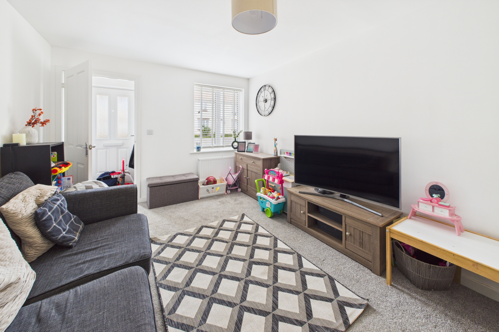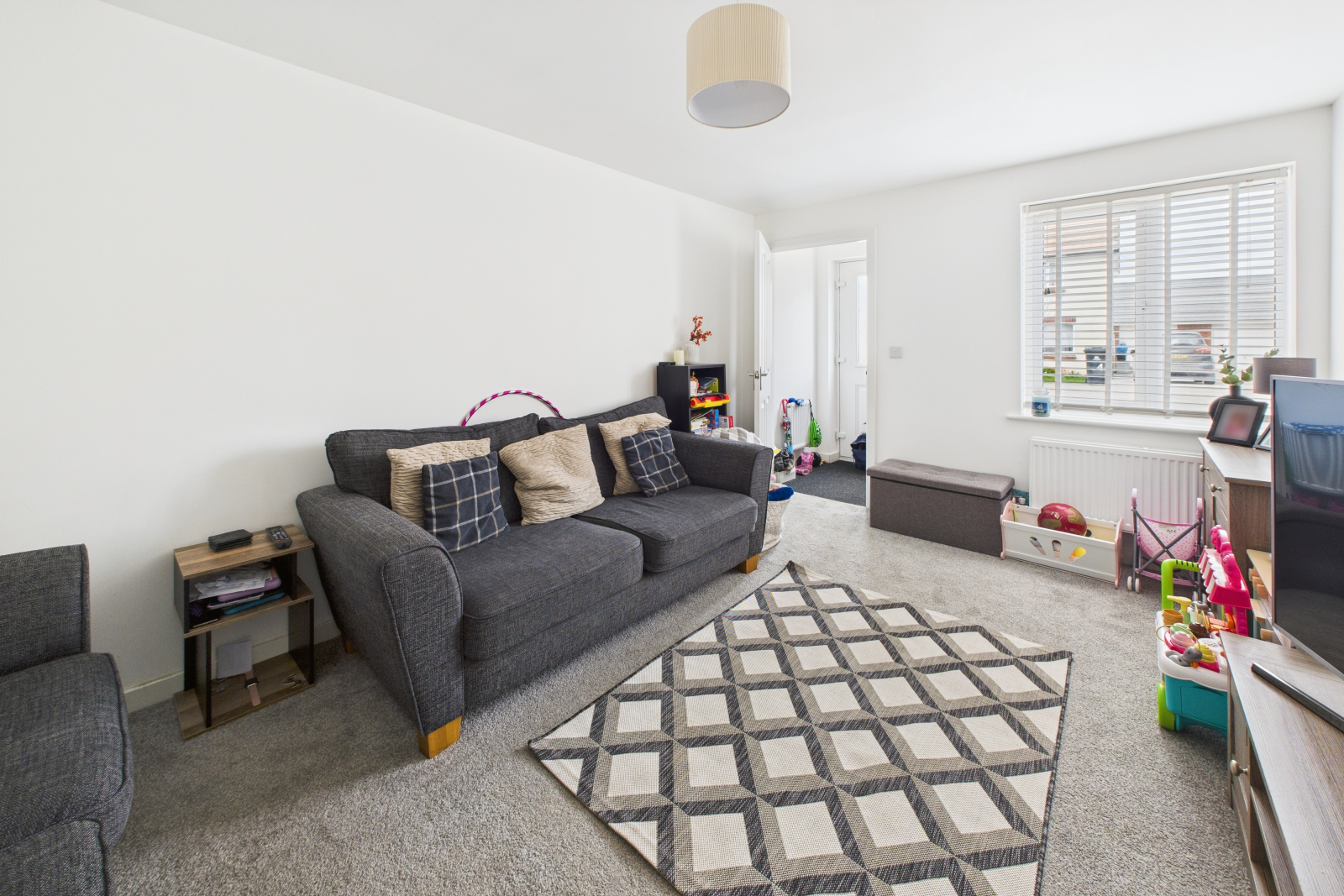 This spacious and inviting lounge features a UPVC double-glazed window to the front, filling the room with natural light. Fully carpeted, the room is complete with central pendant lighting, a radiator, and a selection of power points.