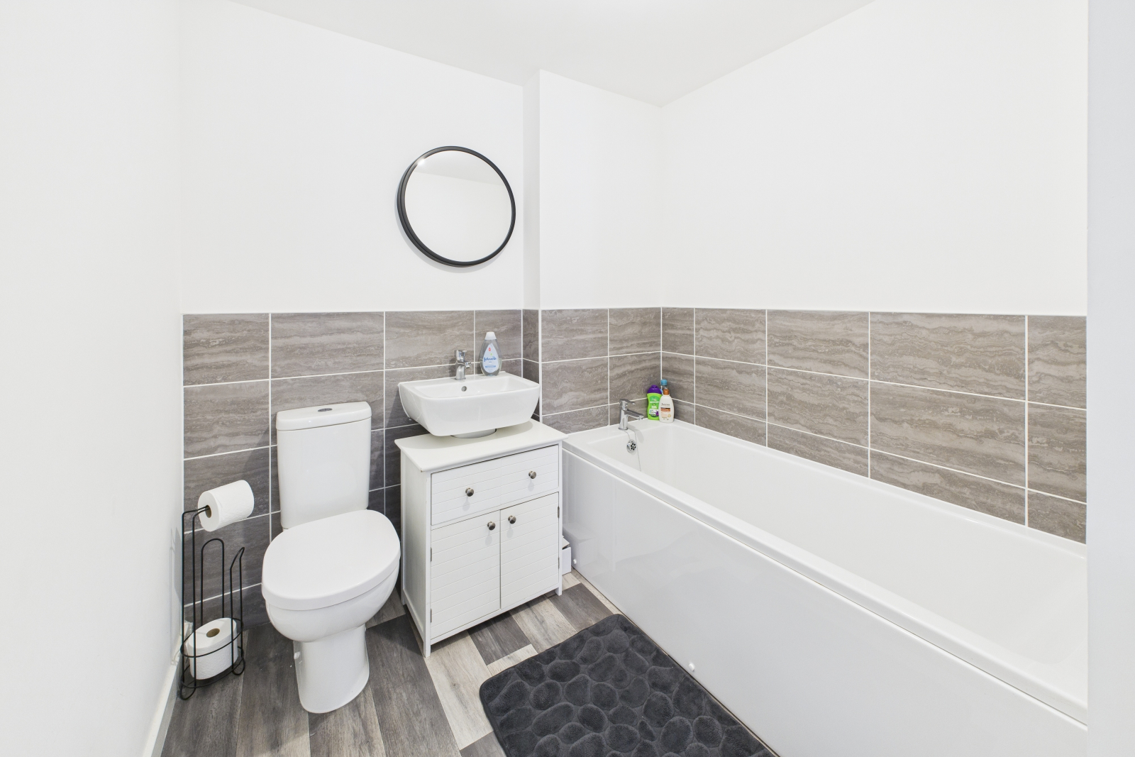 The family bathroom offers a white suite consisting of a low-level push-button W.C, a pedestal wash hand basin with mixer taps, and a panel bath with mixer taps and tiled splashbacks. With wood-effect vinyl flooring, a radiator, central lighting, and an extractor fan, it provides a comfortable space for the whole family.