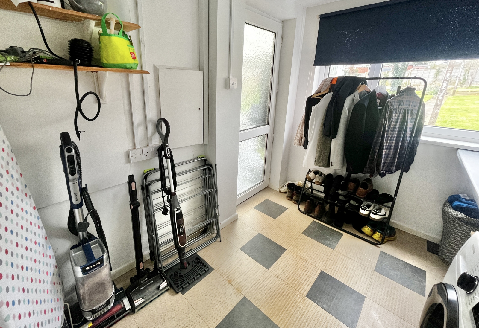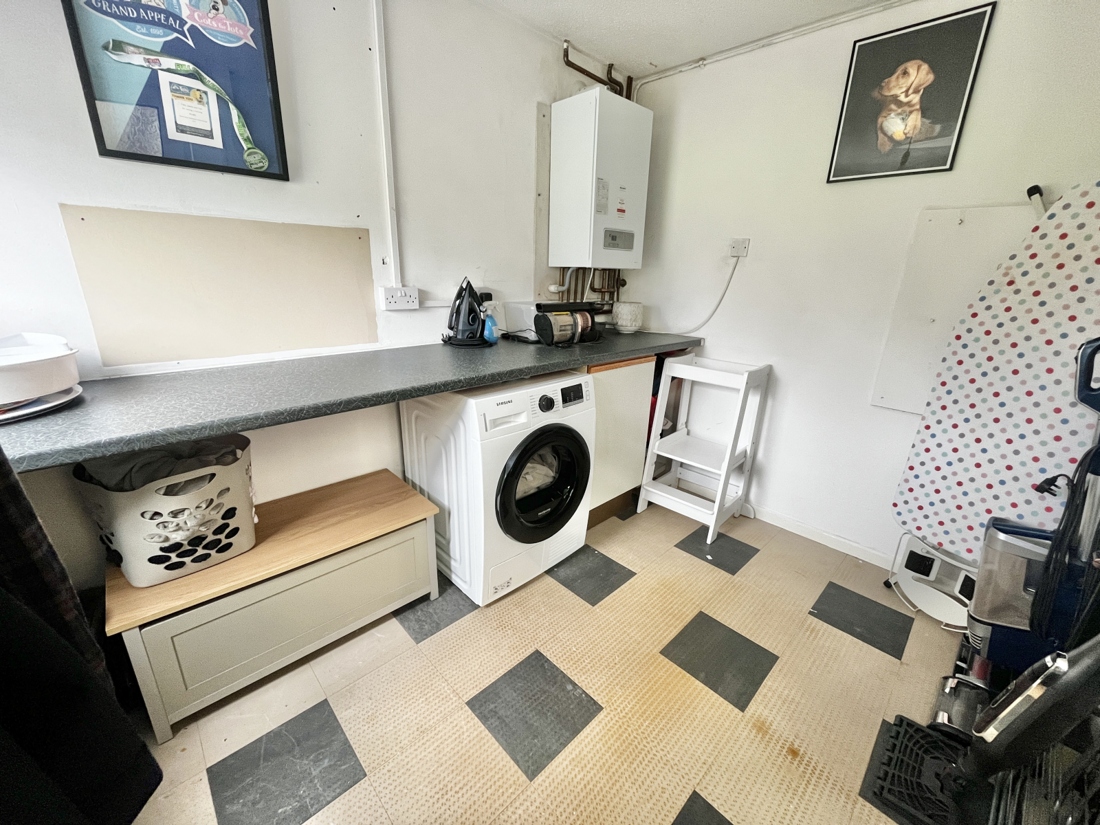 Utility Room 2.74m x 2.13mLarge UPVC double-glazed window to rear elevation. Fitted unit and rolled top work surface with space for under counter appliances and tumble dryer. Wall mounted gas combi boiler. Shelving and storage space. Tiled flooring, central pendant lighting and power points.
