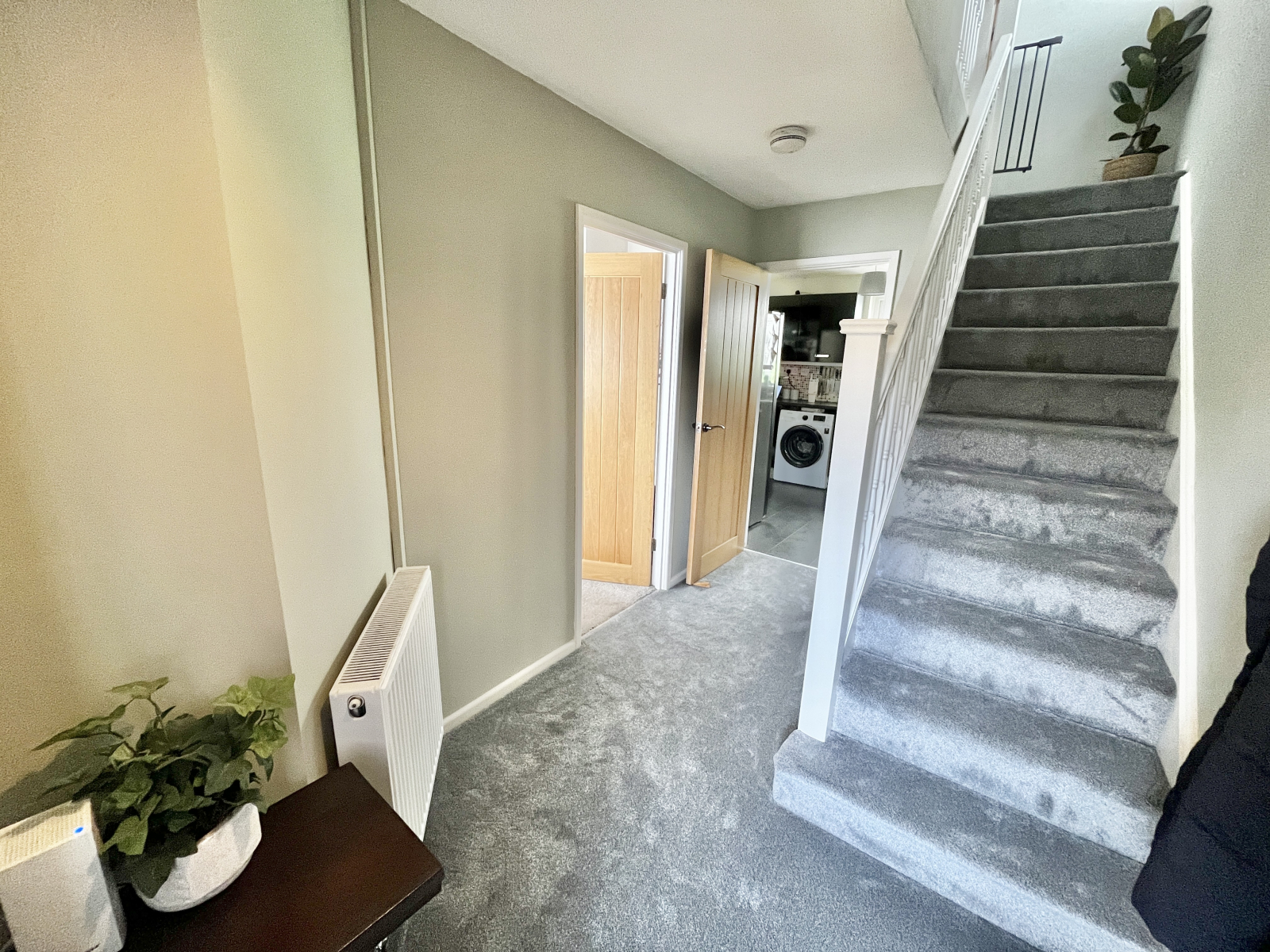 Reception Hallway Recently fully refurbished by the current owners. This welcoming space has newly fitted carpets and open stairwell to the first floor. Central pendant lighting and radiator. Power points and BT point. Charming alcove with coat hooks and open under stairs storage space. Doors leading off.