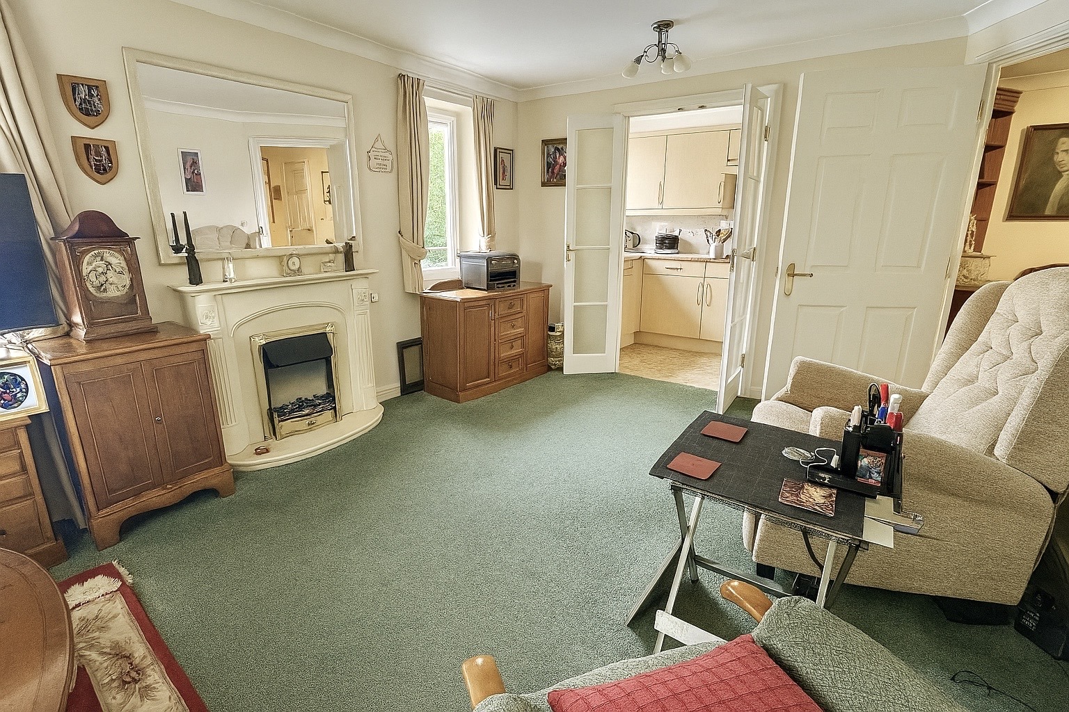 Carpeted flooring, UPVC double-glazed rear windows to rear aspect, feature electric fireplace with stone-effect hearth and wooden surround, two chrome-effect light fittings, wall-mounted electric radiator, TV point, power sockets. Double wooden doors with frosted glass panels to kitchen.
