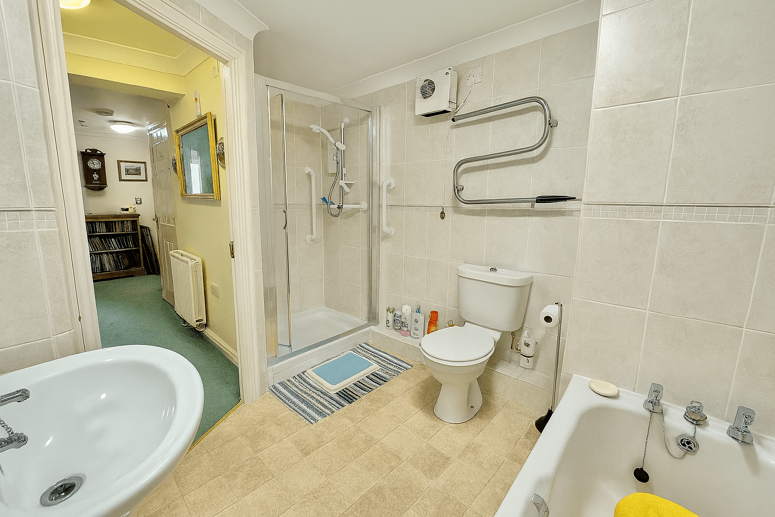Tile-effect vinyl flooring, step-in shower with bi-fold glass door and power shower, panelled bath, low-level W.C., wash basin with storage. Wall-mounted chrome towel rail, separate heater, illuminated mirror with shaver point.