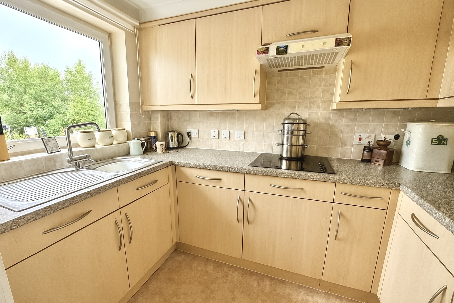 Stone-effect vinyl flooring, large side-facing UPVC double-glazed window, base and wall-mounted units with tiled splashbacks, mid-level electric oven, electric hob with extractor hood, stainless steel sink with mixer tap. Power points, central ceiling strip light.