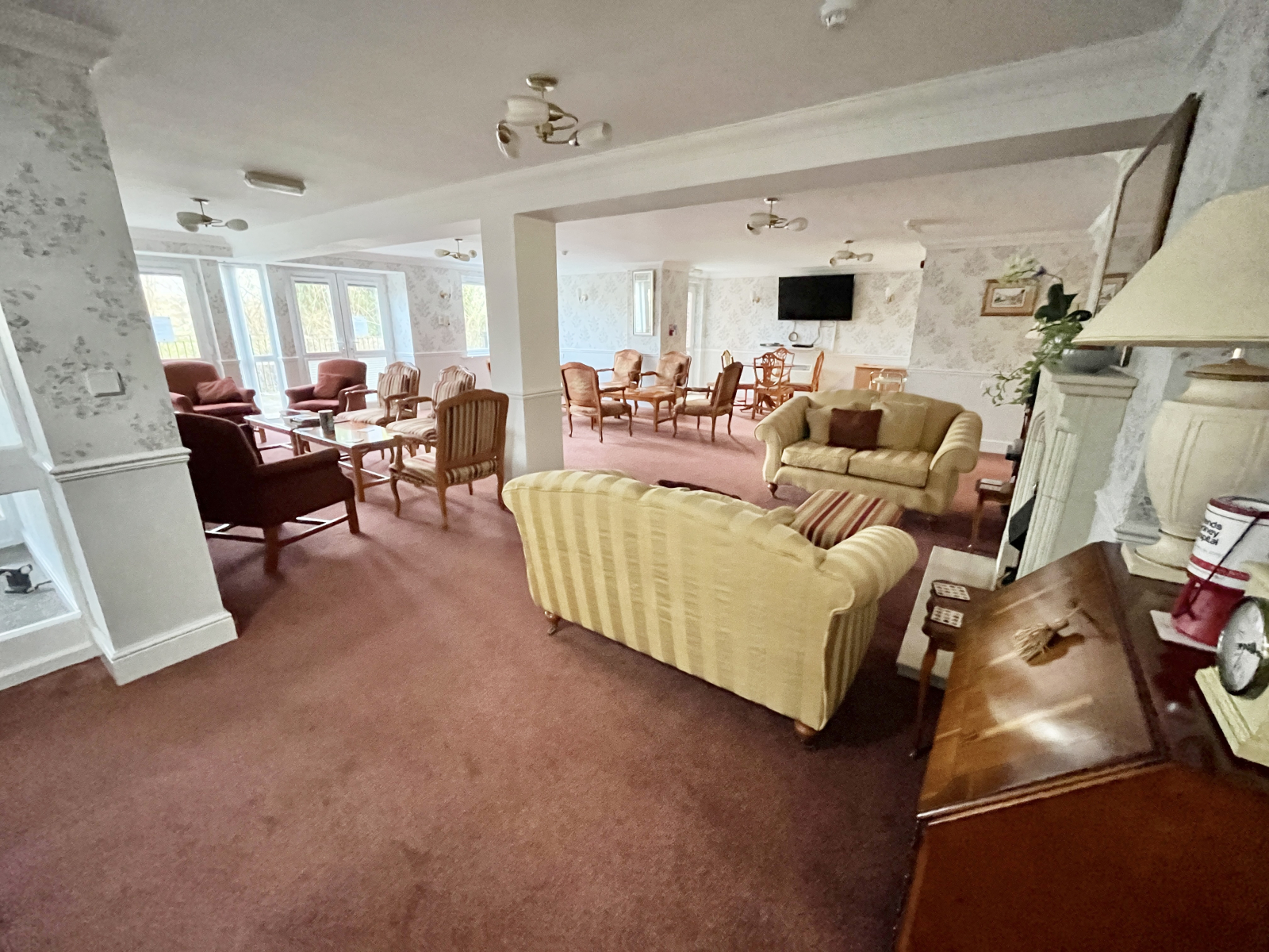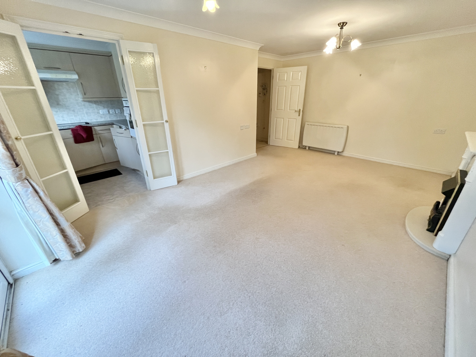 UPVC double-glazed patio doors give access to the patio area. Spacious and bright this room is carpeted with a coved ceiling and central lighting. Power points and electric radiator. Feature fireplace with wooden surround. Double doors to;