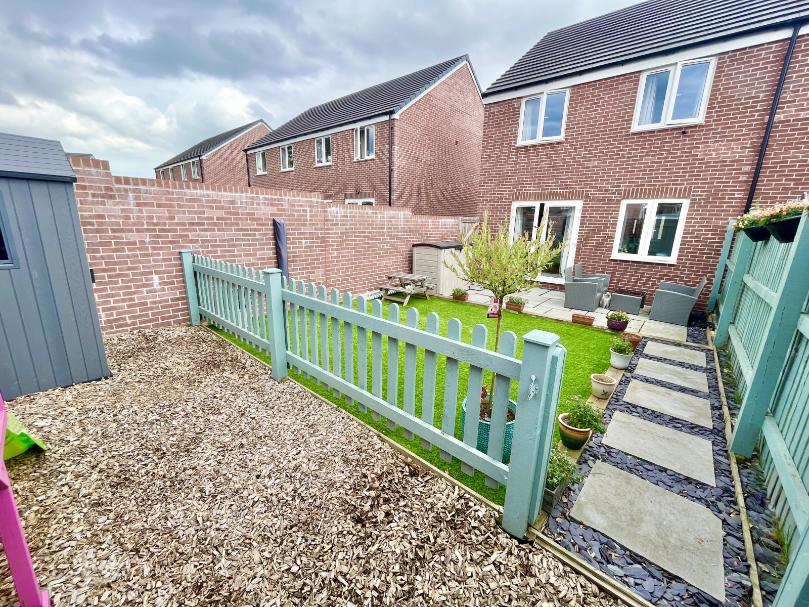 To the rear, the beautifully landscaped garden is securely enclosed by fenced and walled boundaries. Having an artificial lawn for easy maintenance with a charming fenced barked space ideal a for children’s play area. The large slate patio is great for outdoor living and the garden also benefits from gated side access to the driveway.