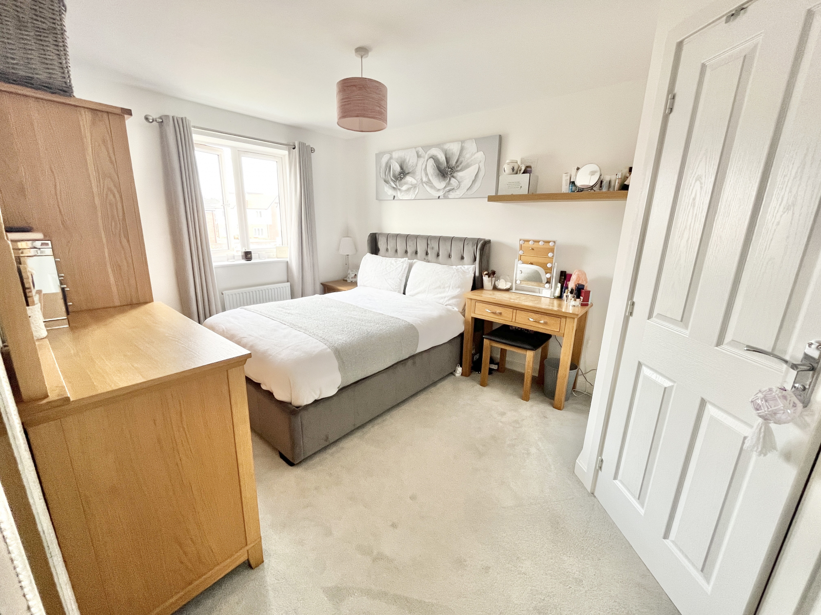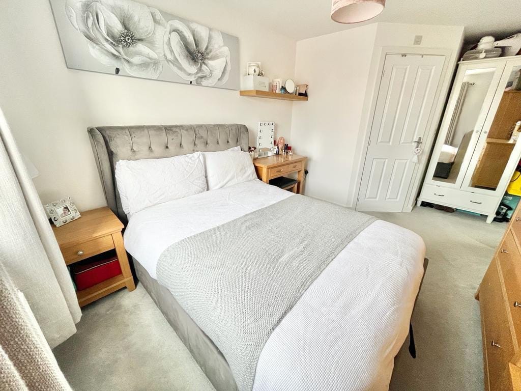 Bedroom One UPVC double-glazed window to rear elevation with radiator under. Carpeted with power points and wall-mounted central heating controls. Central lighting and door to;