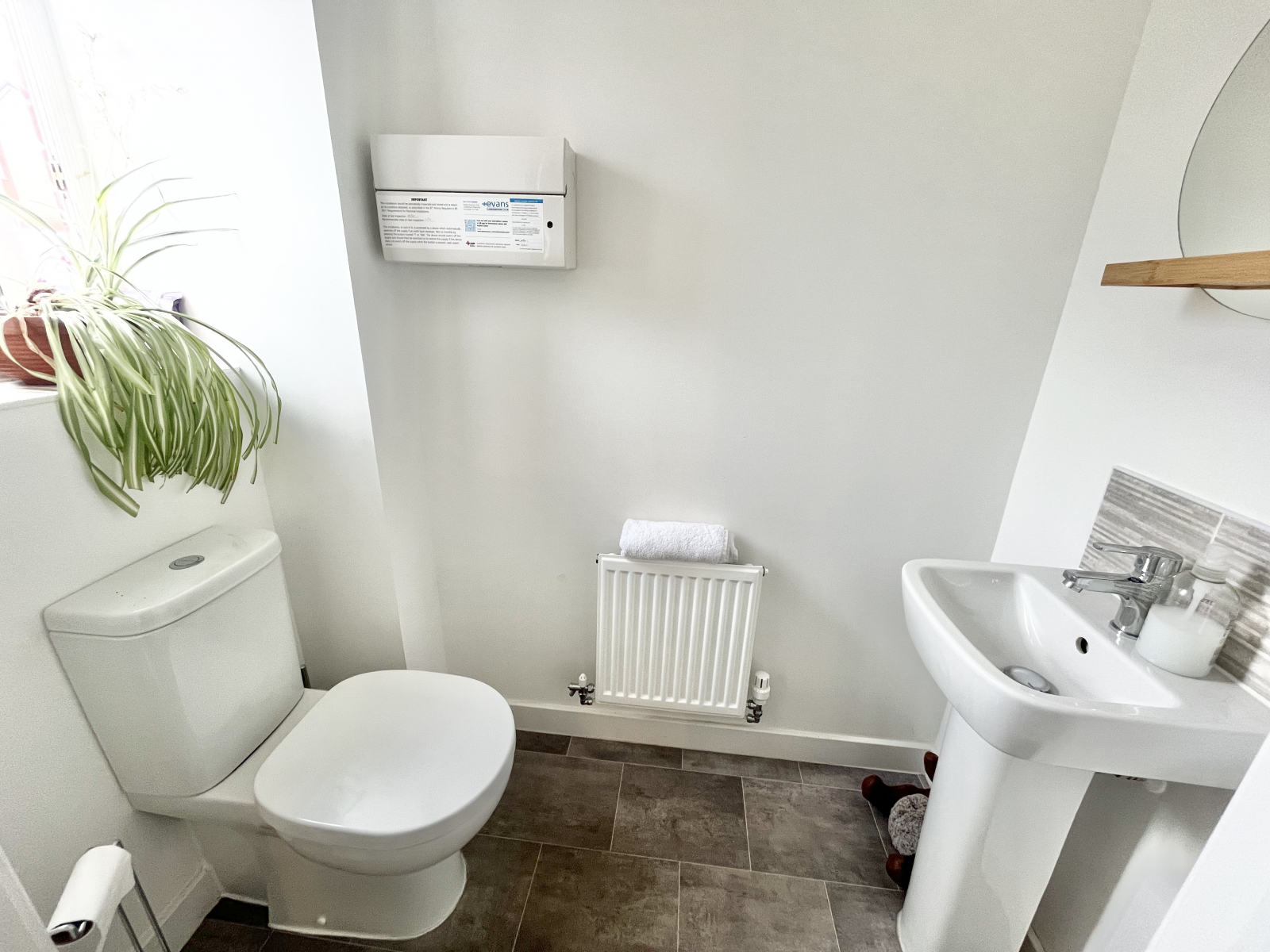 Downstairs cloakroom UPVC double-glazed obscured window to front elevation. White suite comprising of; low-level push button W.C. and pedestal wash hand basin with mixer tap and tiled splash backs. Central lighting and radiator. Vinyl tile effect flooring and electric consumer unit.