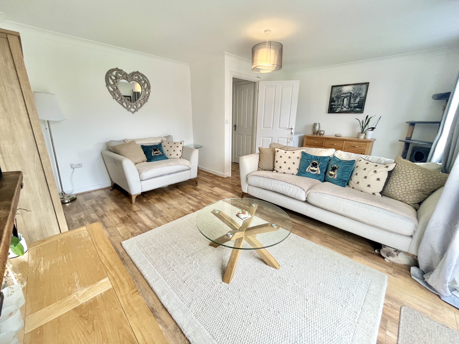 Reception HallwayPanel glazed door and laminate wood effect flooring. Open carpeted stairwell to the first floor and doors leading off. Radiator and wall-mounted central heating controls. Large under-stairs storage cupboard with power points.