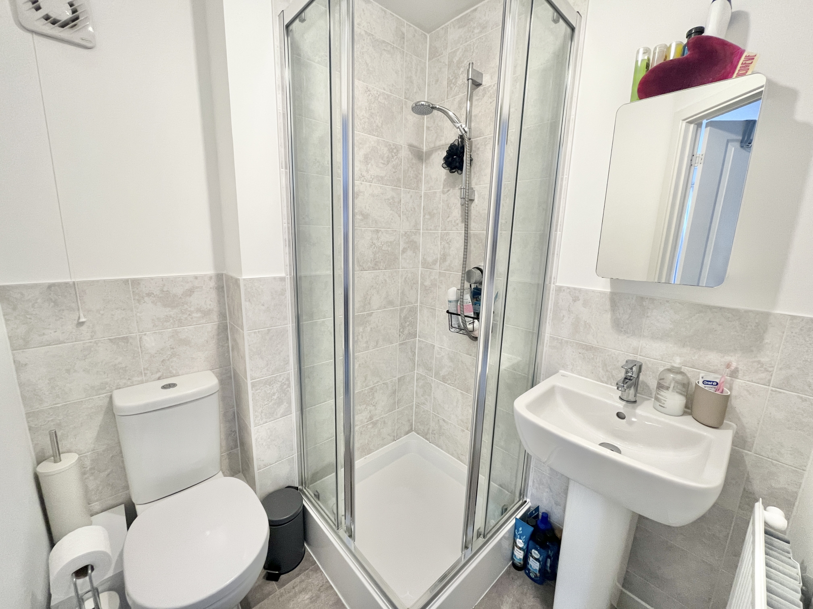 En- Suite White suite comprising of; low-level push button W.C. and pedestal wash hand basin with mixer tap. Step-in corner shower having Mira shower and attachments. Tiled splash backs and vinyl tile effect flooring. Radiator and mirrored vanity unit. Central lighting and extractor fan.