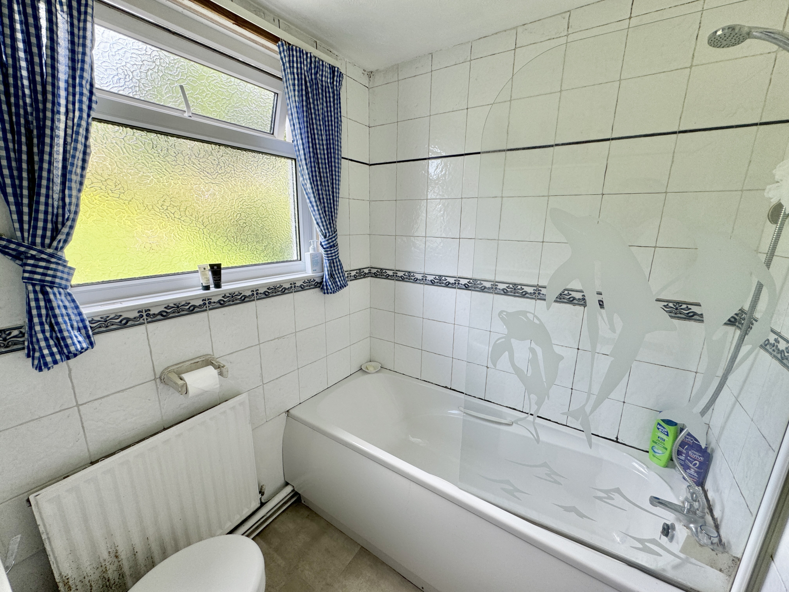 UPVC obscured double-glazed window. Fully tiled with white suite comprising of low level W.C. and pedestal wash hand basin. Panel bath with glazed shower screen and mixer tap having shower attachments. Radiator and vinyl flooring.