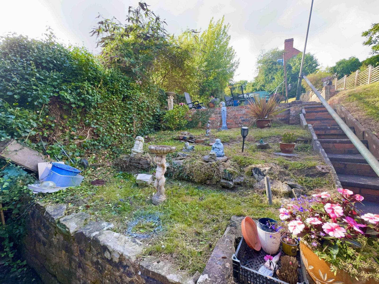 The front of the property includes a sloping lawned garden and a side access path leading to the rear garden. The rear garden features steps, a retaining wall, and a large lawned area with views towards the River Severn from the top section.