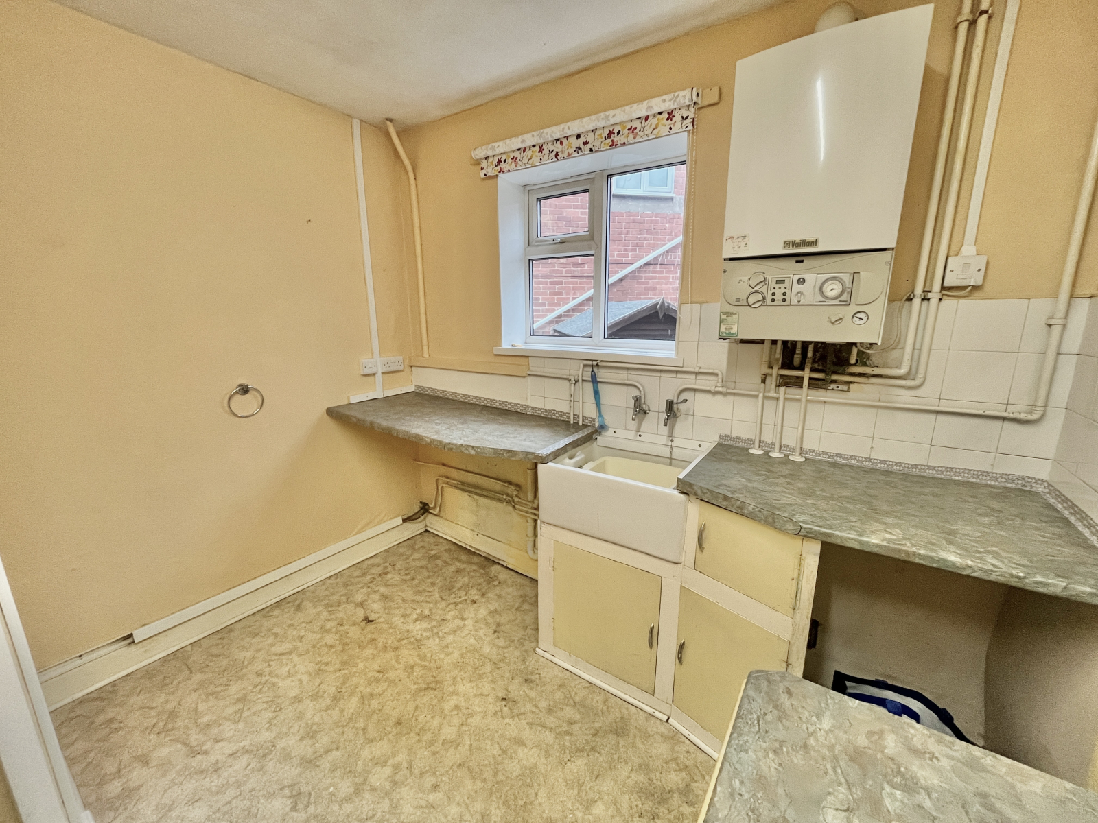 Kitchen UPVC double-glazed window to side elevation. Range of fitted base units and laminate work surfaces. Belfast-style sink and power points. Space for under-counter appliances and cooker. Vinyl flooring and radiator. Door to the pantry with ample shelving and door to understairs storage cupboard.