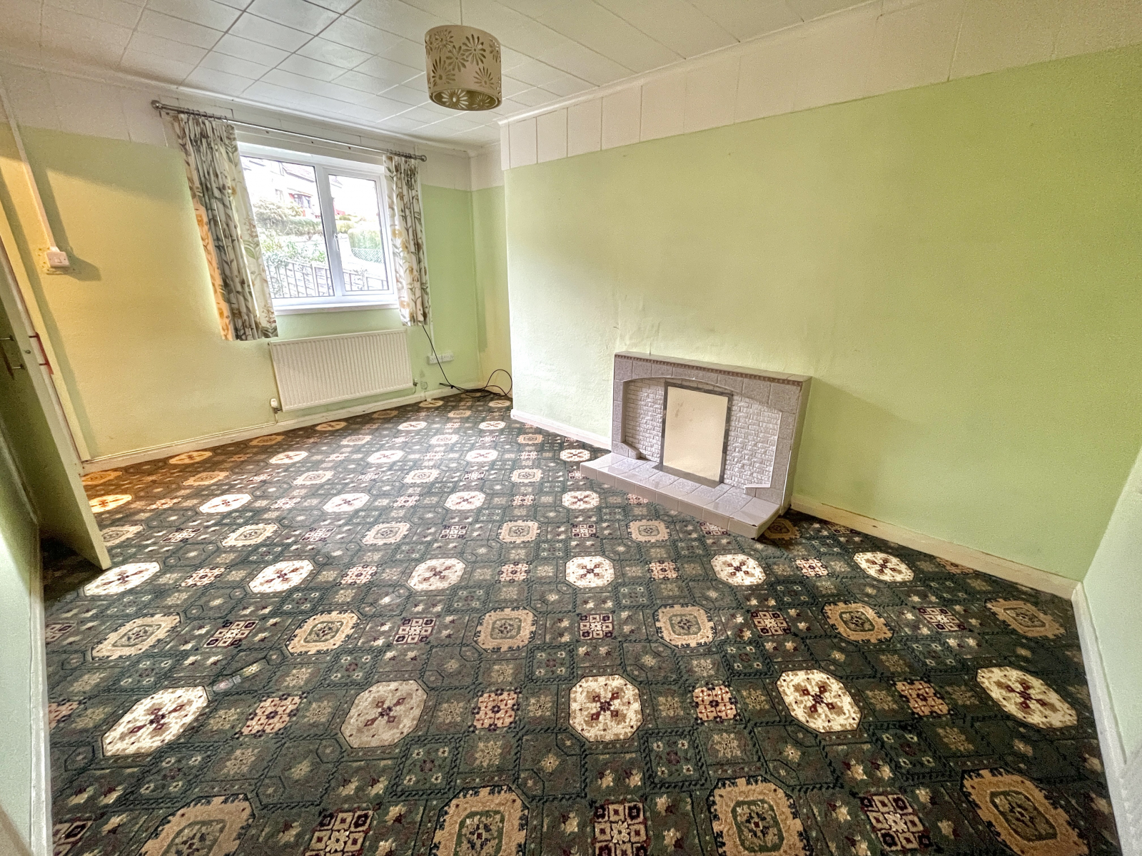 Lounge UPVC double-glazed window to front elevation with radiator under. Tiled fireplace. Carpeted flooring and central lighting. Window into Sun Room with radiator under. Power points and shelving.