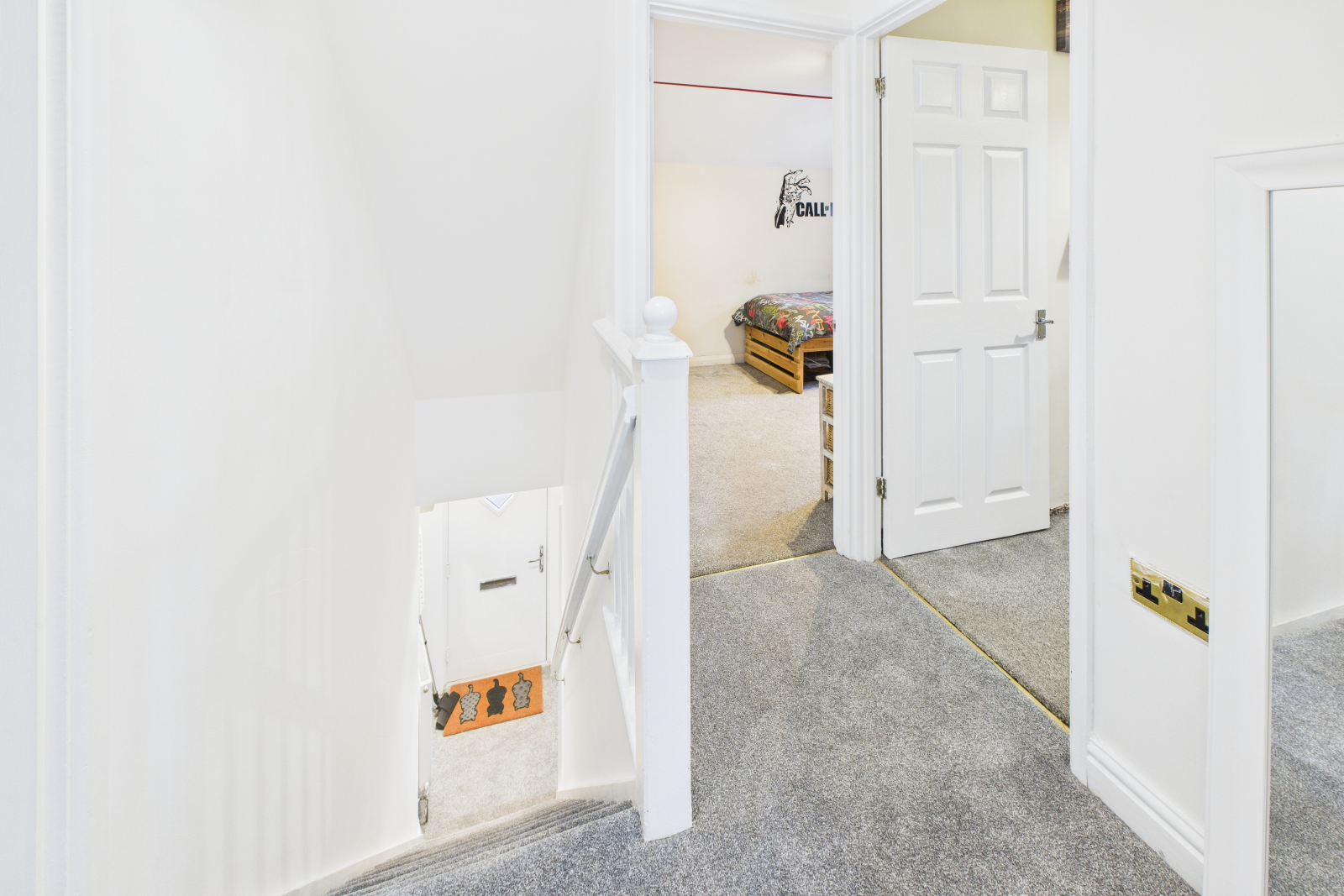 A bright gallery-style landing with carpeted flooring, loft access, power points, and doors leading to all bedrooms.