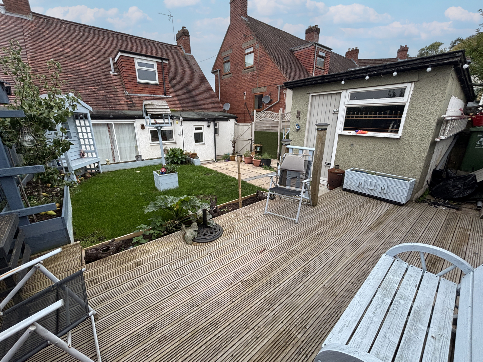 To the rear, the garden benefits from a large paved patio terrace area, perfect for enjoying outdoor living. The garden also boasts a lawned area and large wooden garden shed. An additional sunny decking area is beautifully presented with raised flower borders.