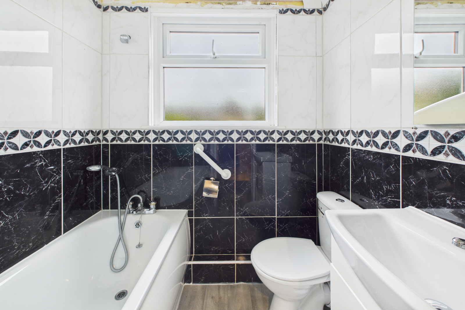 Obscure UPVC double-glazed window to the rear. White suite comprising a low-level WC and panel bath with shower attachments, wash hand basin with vanity unit, and mirrored bathroom cabinet over. Fully tiled with vinyl flooring and heated towel rail.