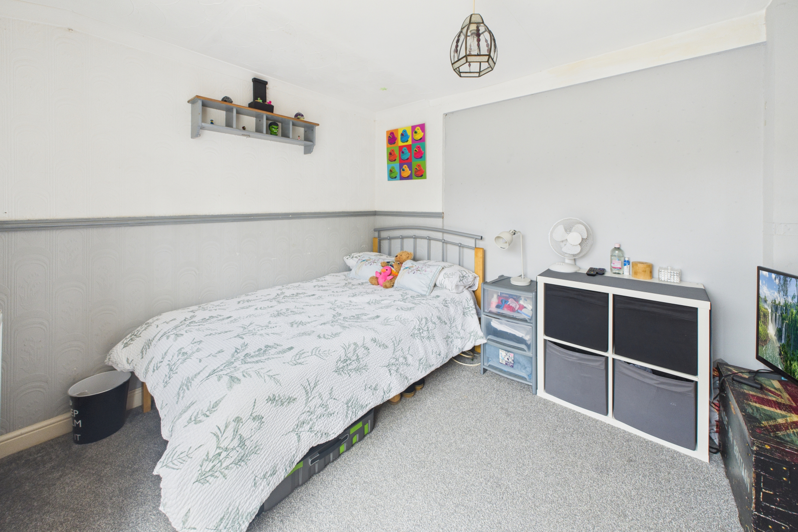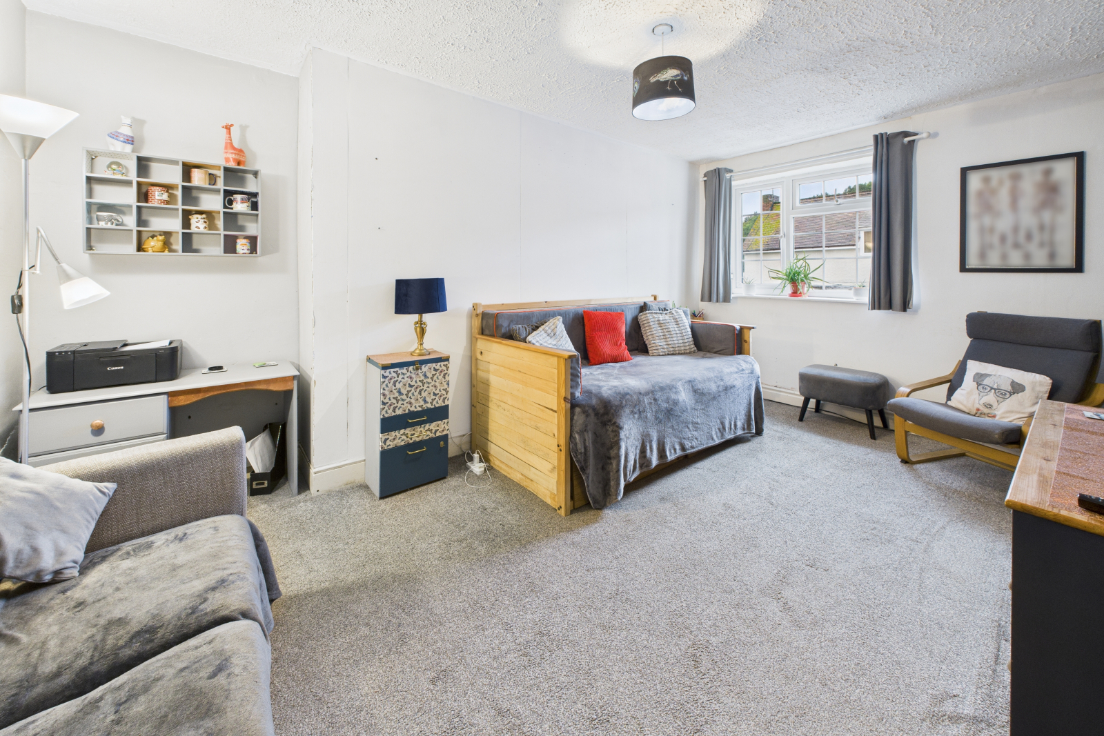 A spacious double room with a large UPVC double-glazed window to the front aspect, flooding the room with natural light. Featuring carpeted flooring, pendant lighting, radiator, power points, and a fitted storage cupboard with shelving.