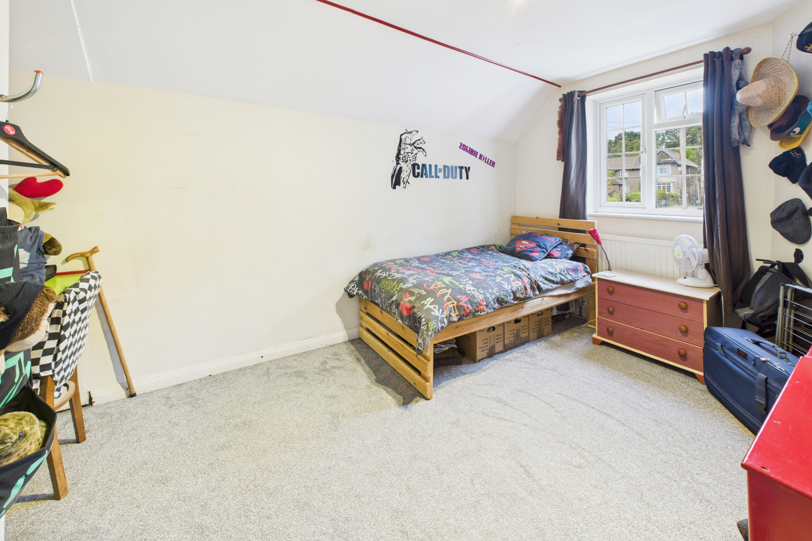 A comfortable double bedroom with a UPVC double-glazed window to the side elevation. Carpeted flooring, radiator, central lighting, and power points.