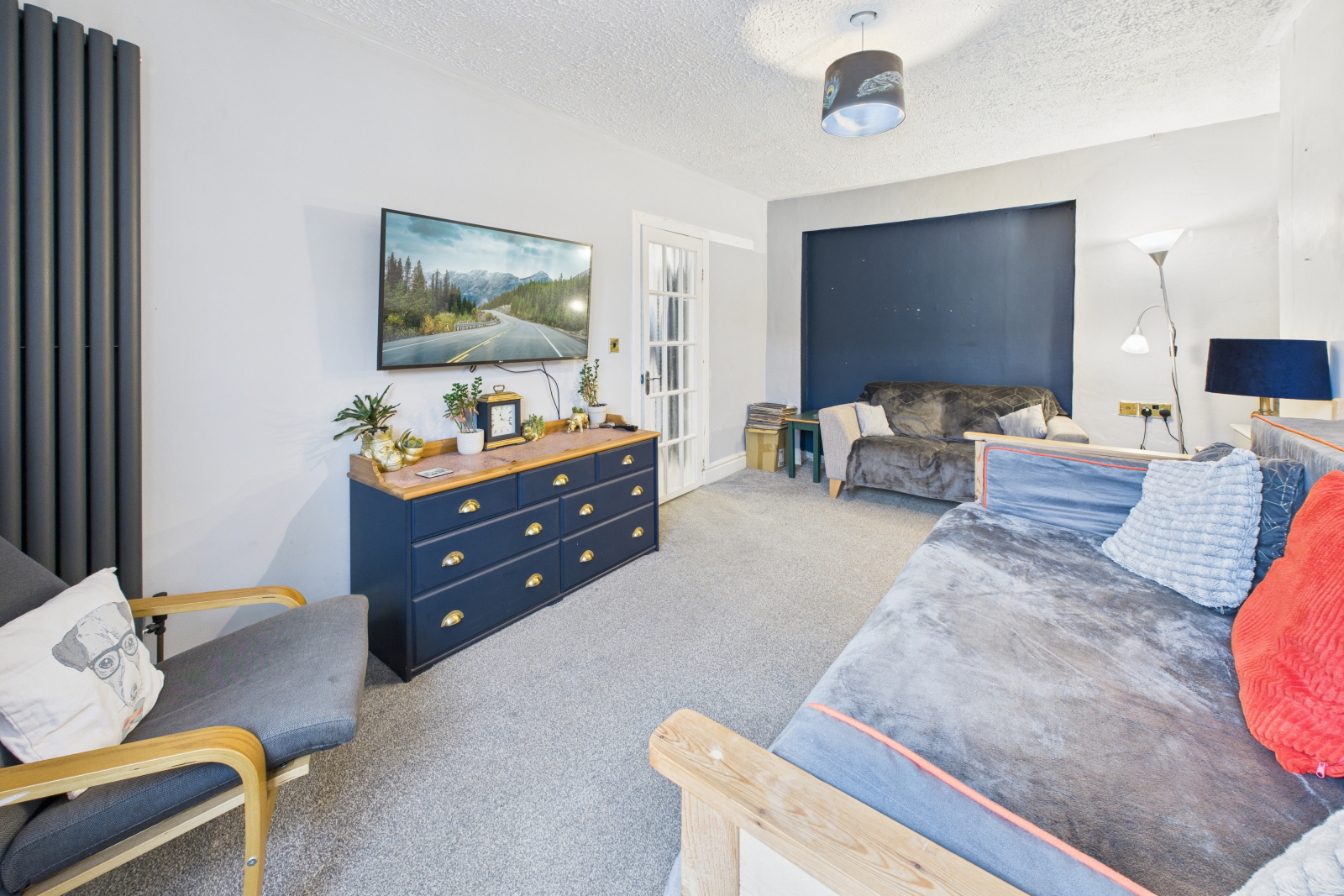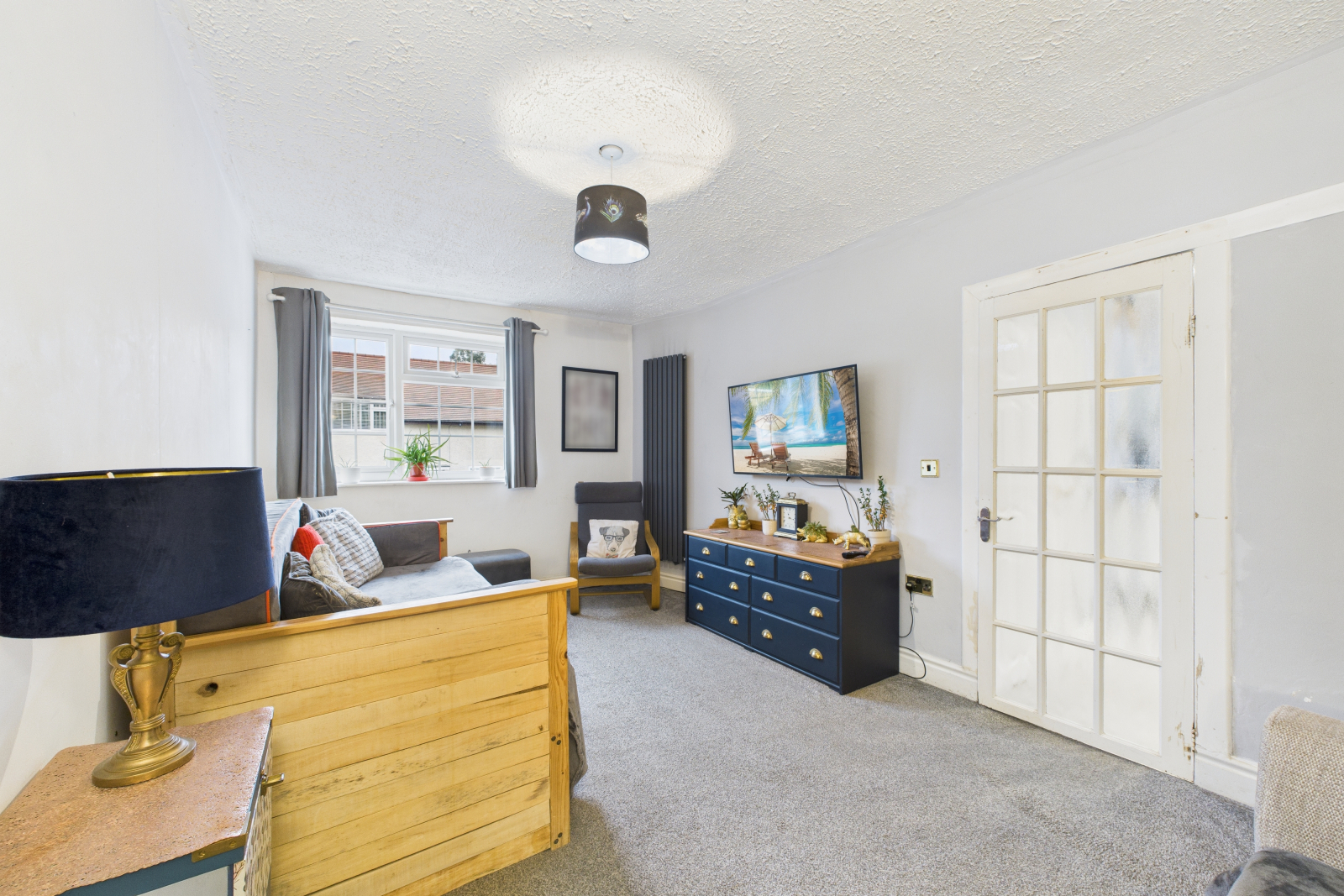 A comfortable and inviting room with a UPVC double-glazed window to the front elevation, perfect for cosy evenings in. Featuring carpeted flooring, modern vertical radiator, central ceiling light, and a range of power points.
