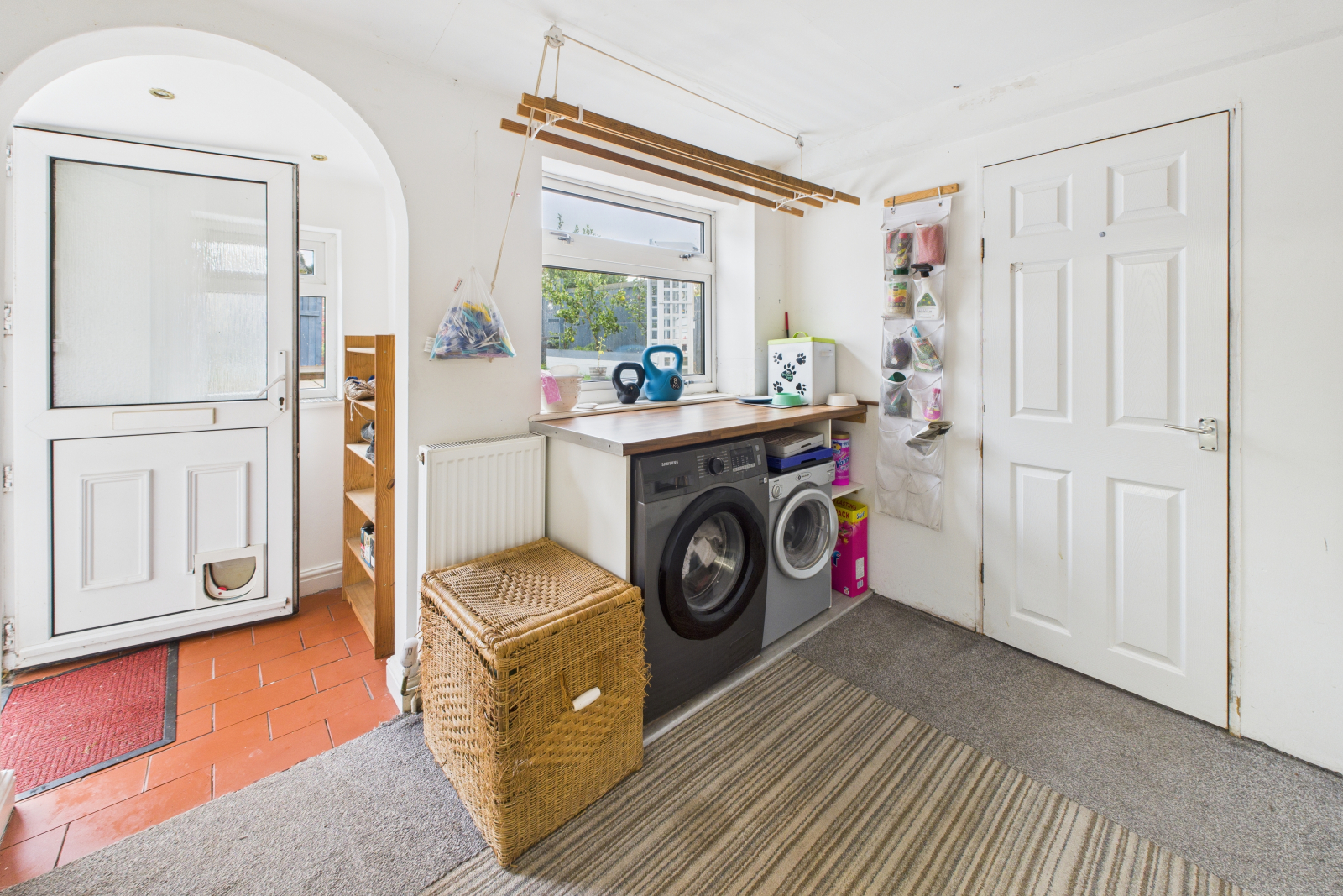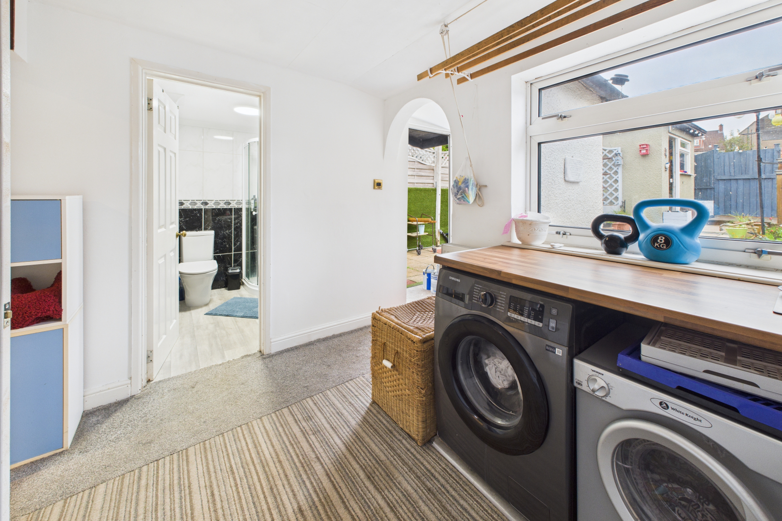 With a double-glazed window overlooking the rear garden, this practical space includes a range of fitted units and drawers with wood-effect work surfaces. There is space and plumbing for a washing machine, tumble dryer, and other under-counter appliances.