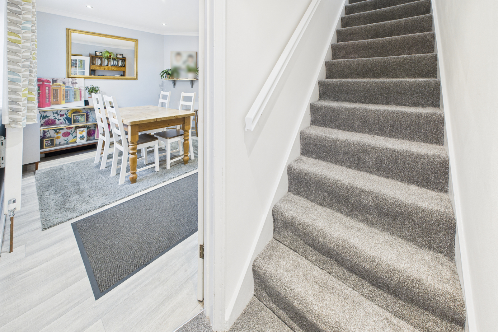 A welcoming entrance with an obscure glazed panelled door, newly fitted carpet, and an open staircase leading to the first floor. Spot lighting, radiator, and a glazed door providing access to the kitchen/diner.