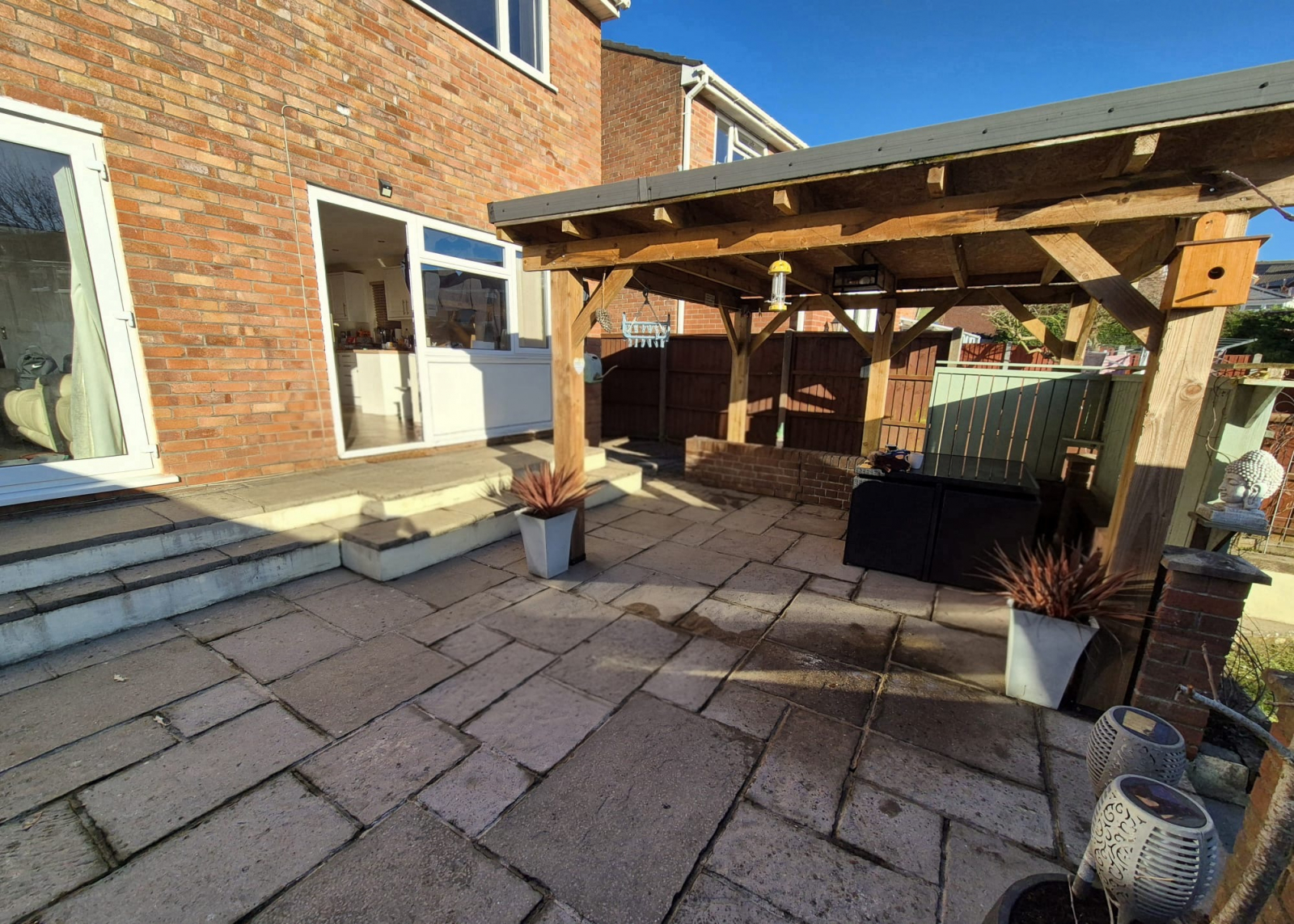 A large landscaped flagstone patio provides a fantastic space to enjoy the sunny garden, complete with a timber pergola. Steps lead down to a lawned area with mature decorative shrubs. Outside water supply and lighting.