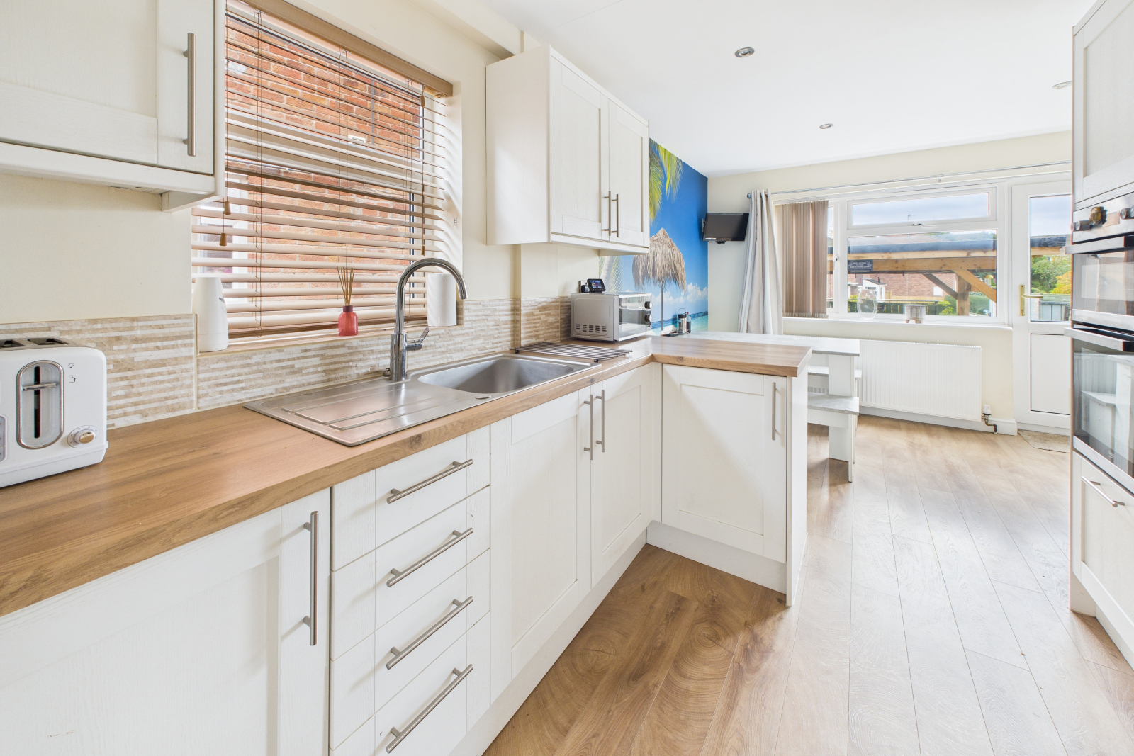 A large uPVC double glazed window and matching glazed door to the rear. Wood-effect laminate flooring. Space for dining table or seating area. The kitchen comprises a range of base and eye-level cabinets, built-in fridge freezer, eye-level oven and grill, five-ring gas hob, and chrome-effect sink and drainer with mixer tap over. Wood-effect roll-top work surfaces and tiled splashbacks. uPVC double glazed window to the side aspect. Power points and spot lighting.