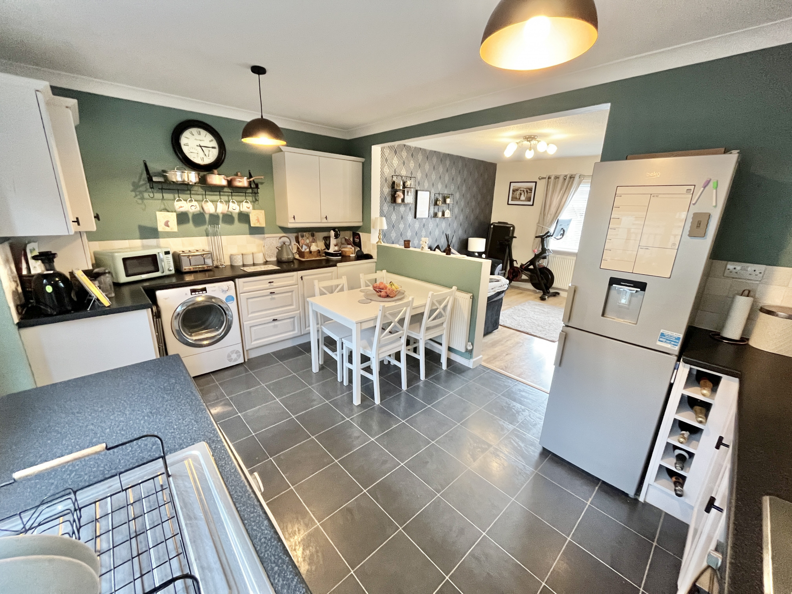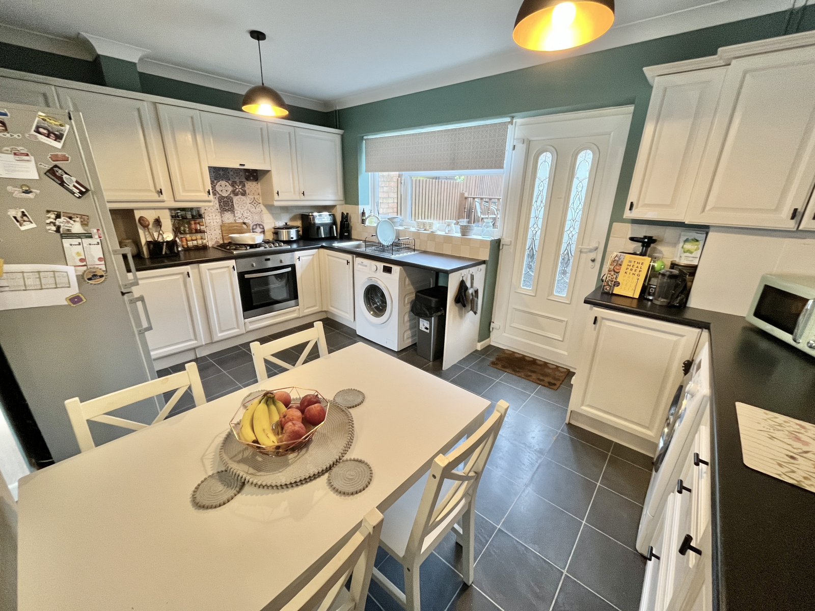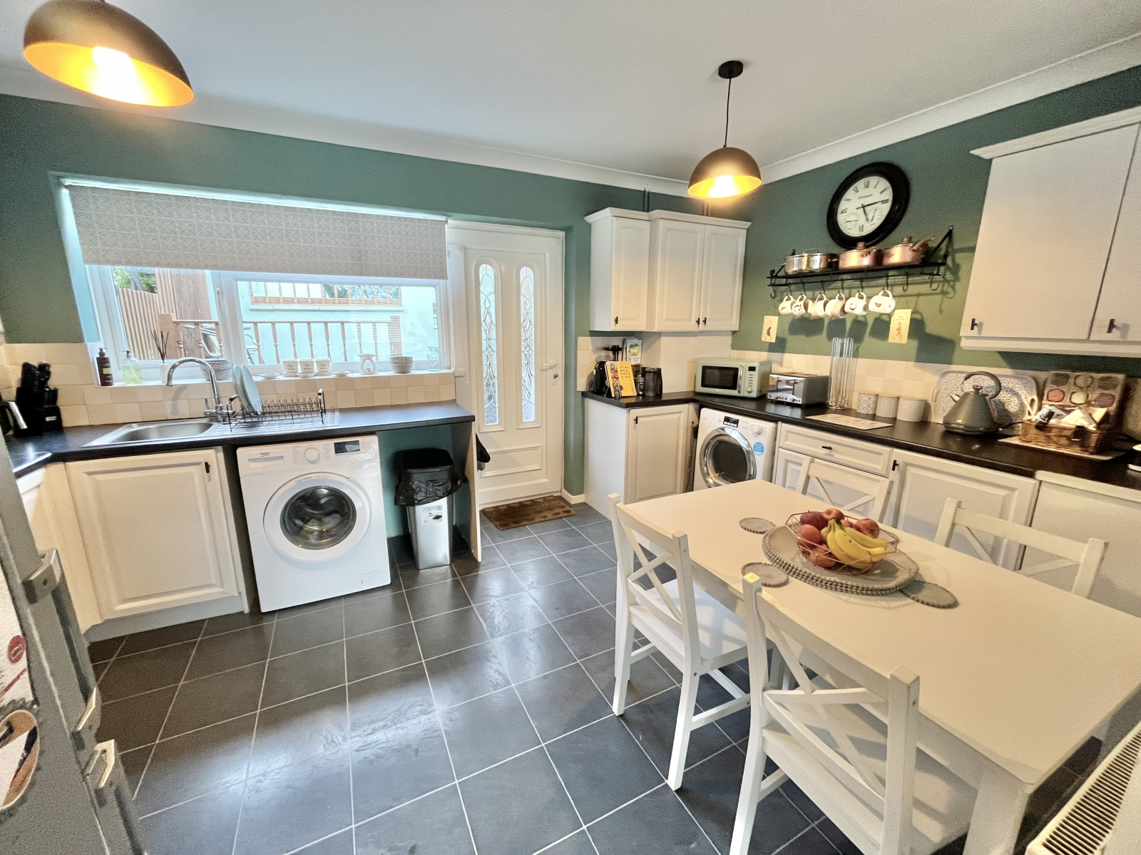 Spacious and great for entertaining. Large UPVC double-glazed window to rear elevation overlooking the garden and UPVC door to garden with inset glazed panels. Excellent range of base and eye-level fitted units and drawers with rolled top work surfaces and tiled splash backs. Stainless steel sink and drainer with mixer tap. Integrated electric oven and four-ring gas hob with extractor above. Space for washing machine/ slimline dishwasher and tumble dryer. Tile effect flooring and radiator. Cupboard housing wall-mounted Worcester boiler. Space for dining table.
