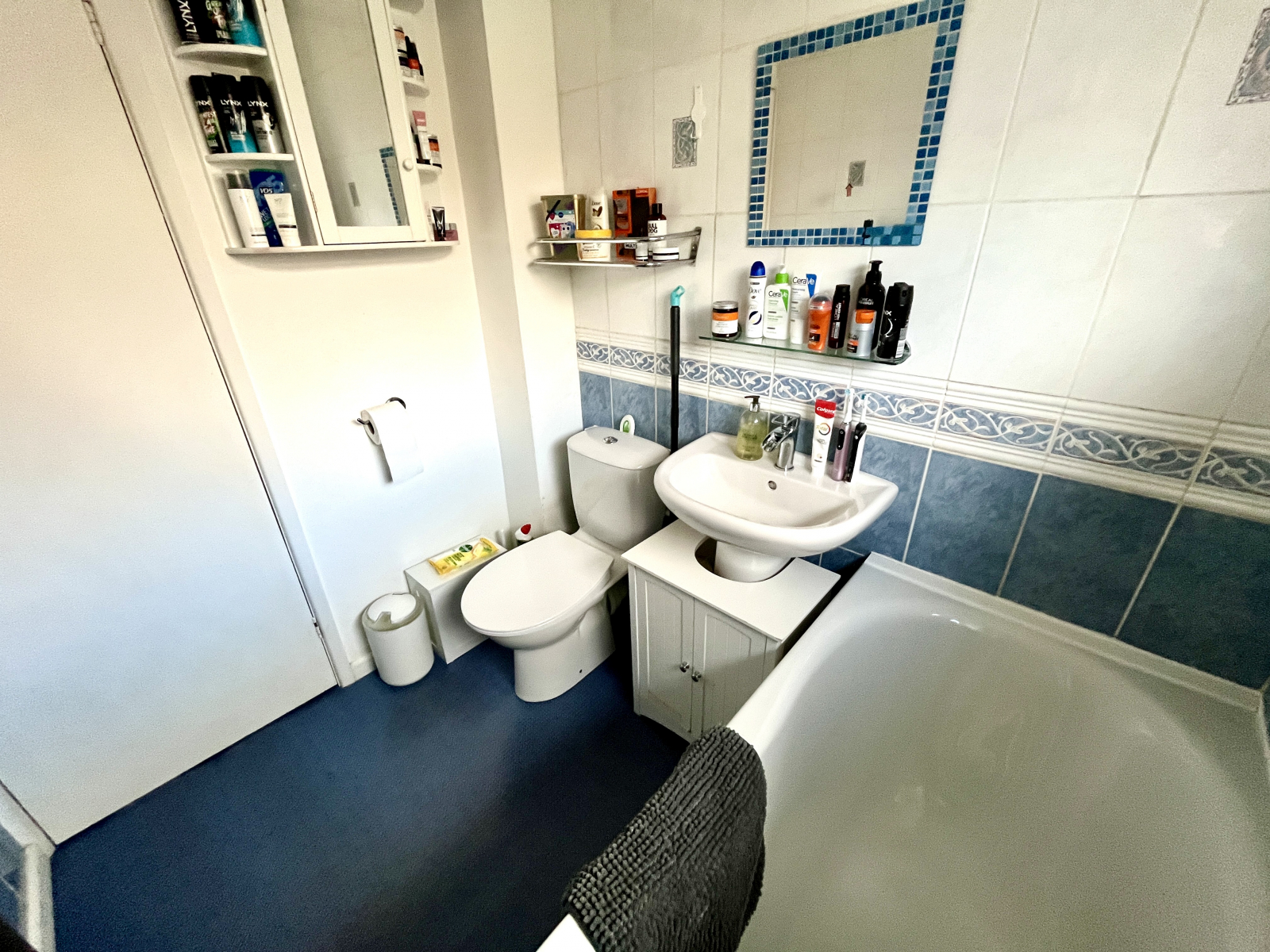 UPVC obscured double-glazed window to the rear. White bathroom suite comprising of; low-level push button W.C and pedestal wash hand basin. Panel bath with Mira shower over and attachments. Glazed shower screen and curtain. Tiling to three walls with tiled border. Central lighting and heated towel rail. Vinyl flooring and wall-mounted vanity unit.