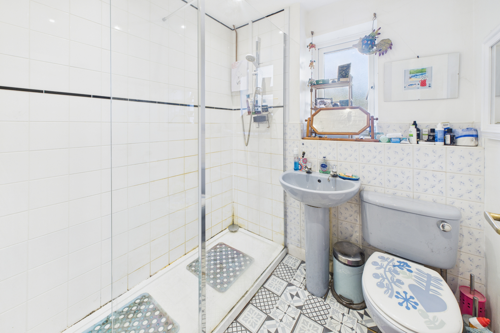 Tile-effect flooring, UPVC obscure double-glazed window to rear aspect, low-level W.C. with push flush, pedestal wash hand basin with hot and cold tap, walk-in shower with wall-mounted shower head, fan.