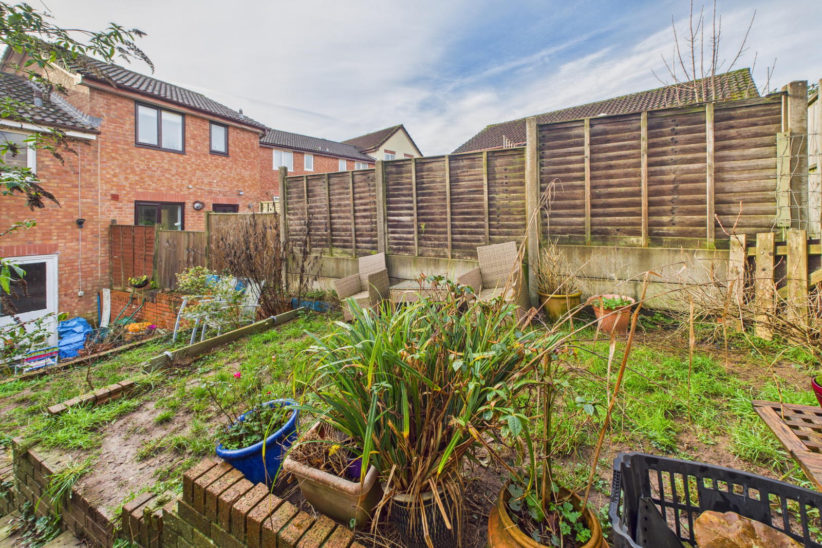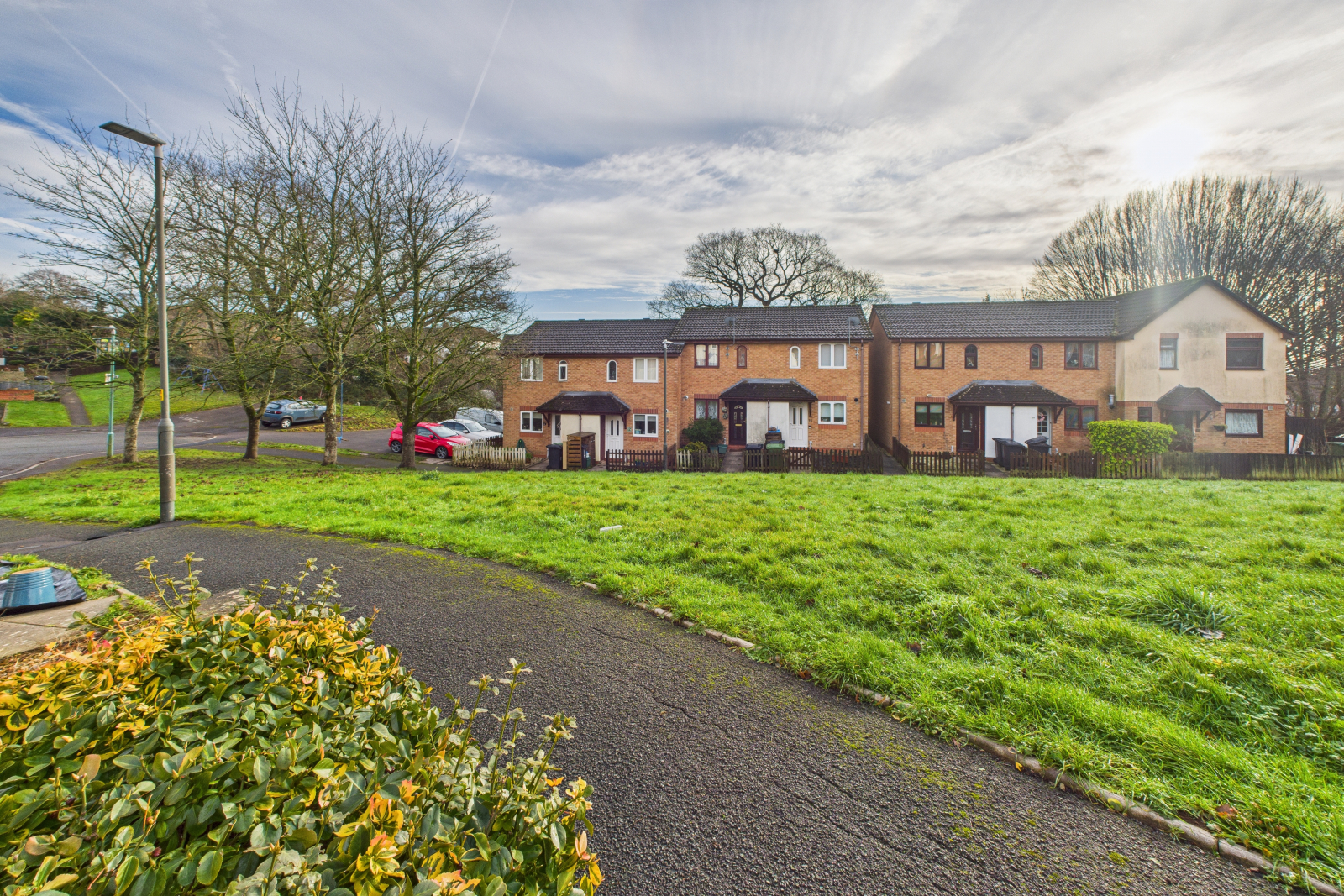 The property is approached via a paved pathway leading to the covered entrance porch and main front door. The front garden is a mix of lawn with established shrubbery and planting. There is also an external storage area to the front of the property, providing useful space for general storage. The front also looks out onto green communal space.