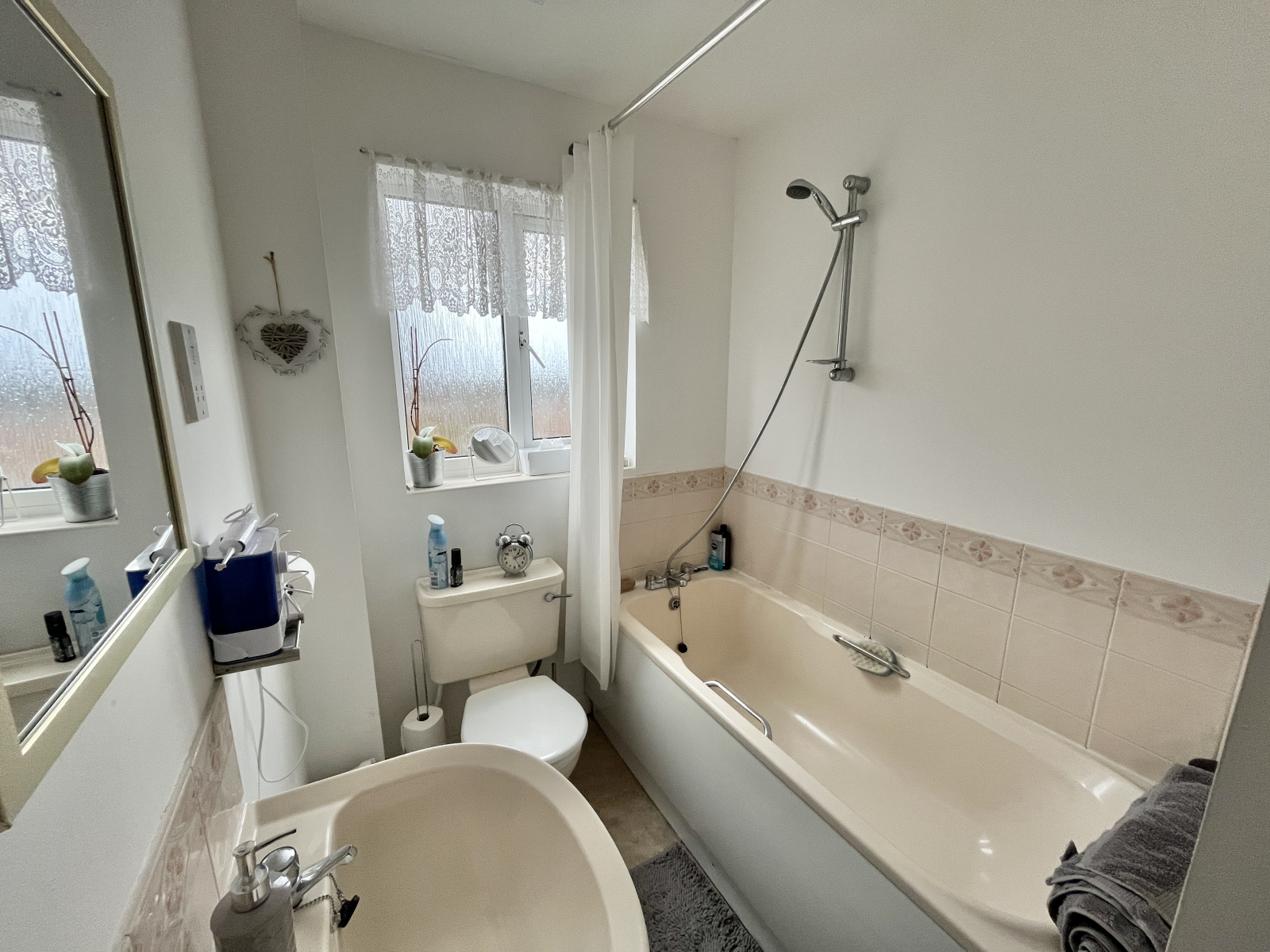 Family Bathroom UPVC double-glazed window to side elevation. Panel bath with mixer taps and shower attachment. W.C. and pedestal wash hand basin. Tiled splashbacks and vinyl flooring. Radiator, shaving point, and extractor.