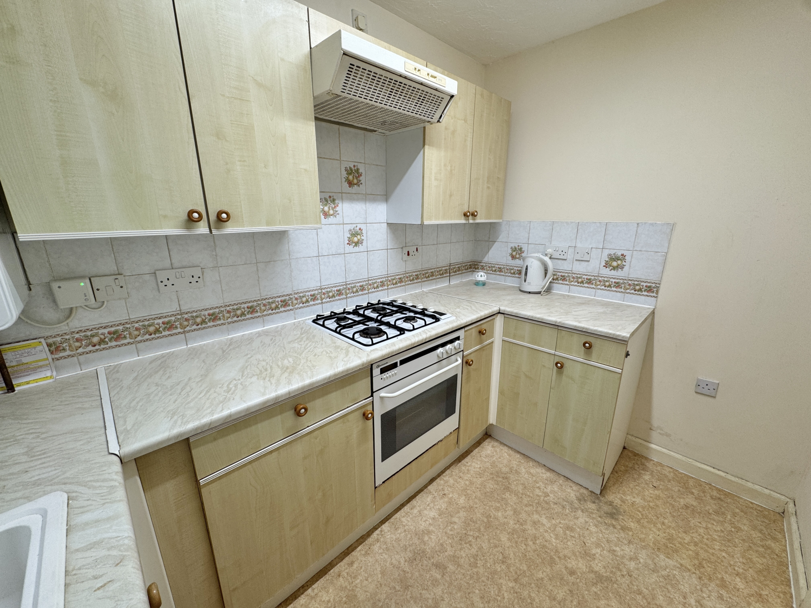 Vinyl flooring, UPVC double glazed window to front aspect. Modern combi boiler. Range of base and eye level fitted units and drawers with worksurfaces and tiled splash backs. Space for the fridge/ freezer. Oven and four ring gas hob. Radiator and power points.