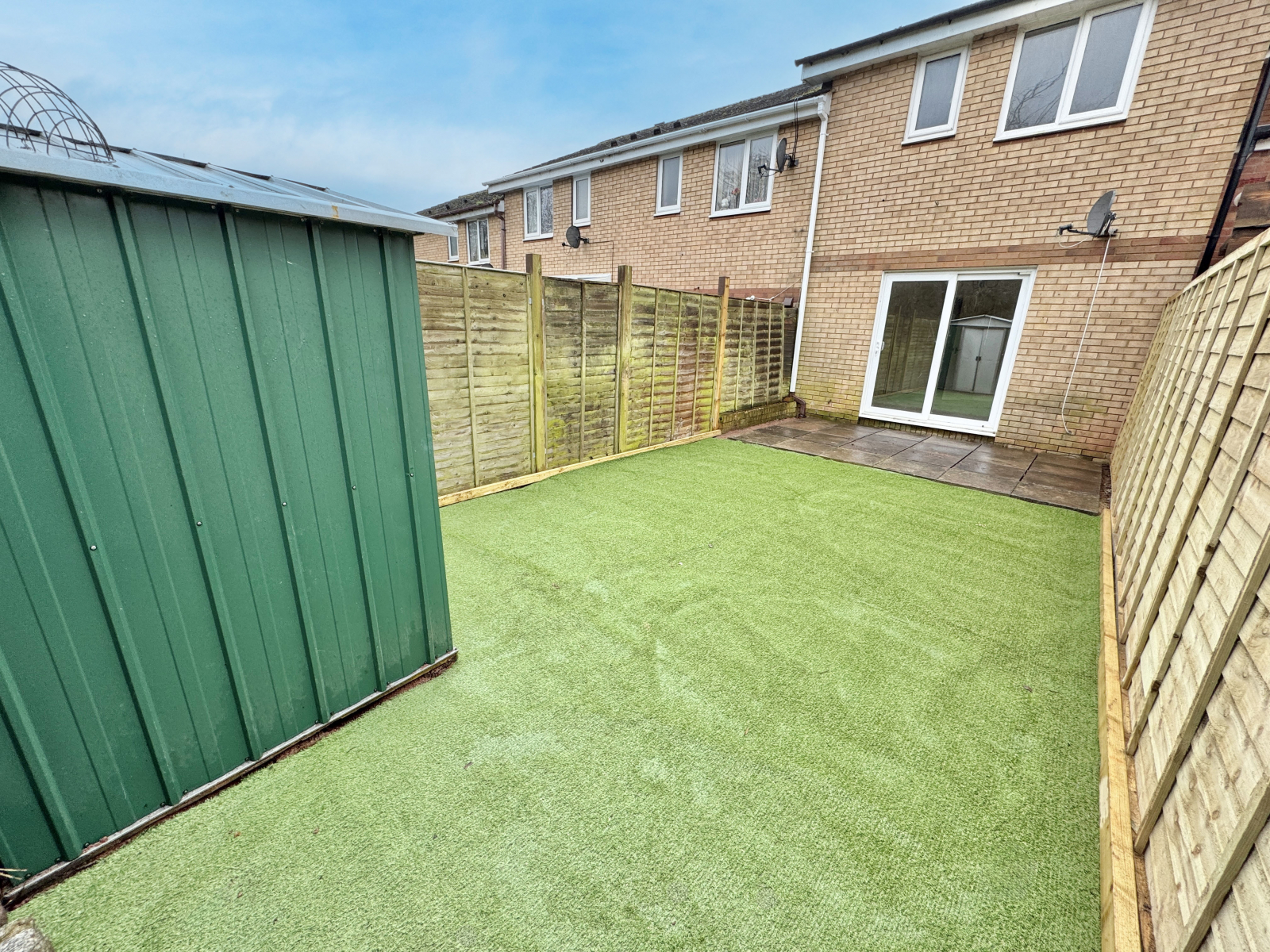The rear garden has recently been upgraded with new fencing, landscaping and artificial lawn. A Rear gate leads to open outdoor space.