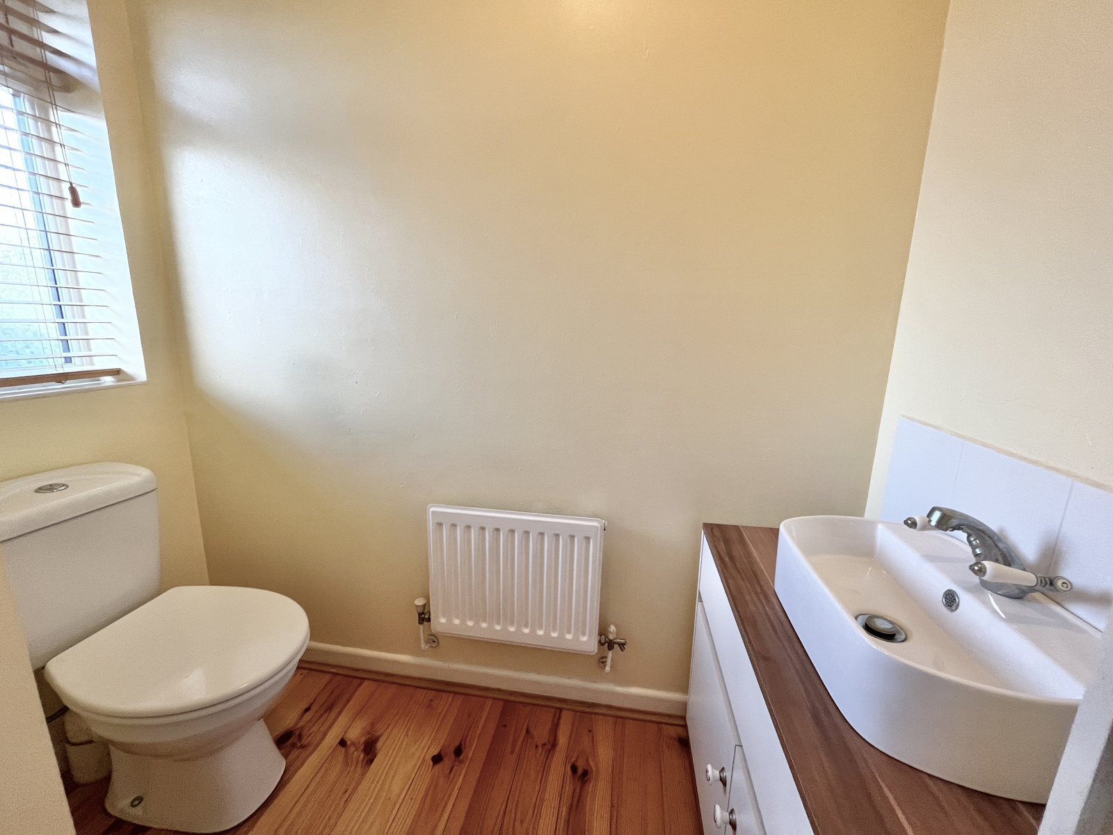 UPVC double-glazed window to front elevation. Modern white suite comprising of; low-level push button W.C and vanity sink cabinet with mixer taps and tiled splashbacks. Solid wooden flooring, central lighting, and radiator.