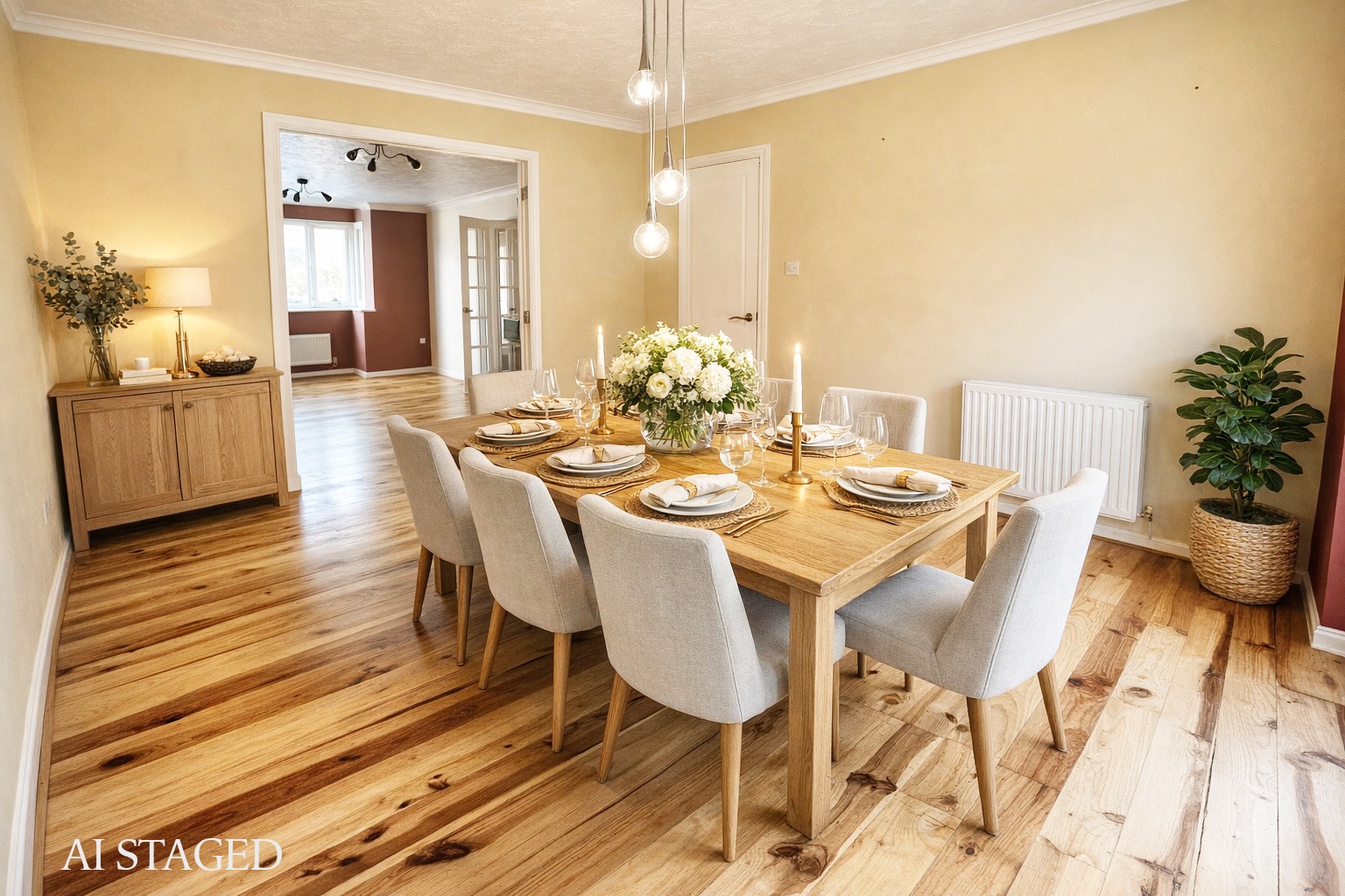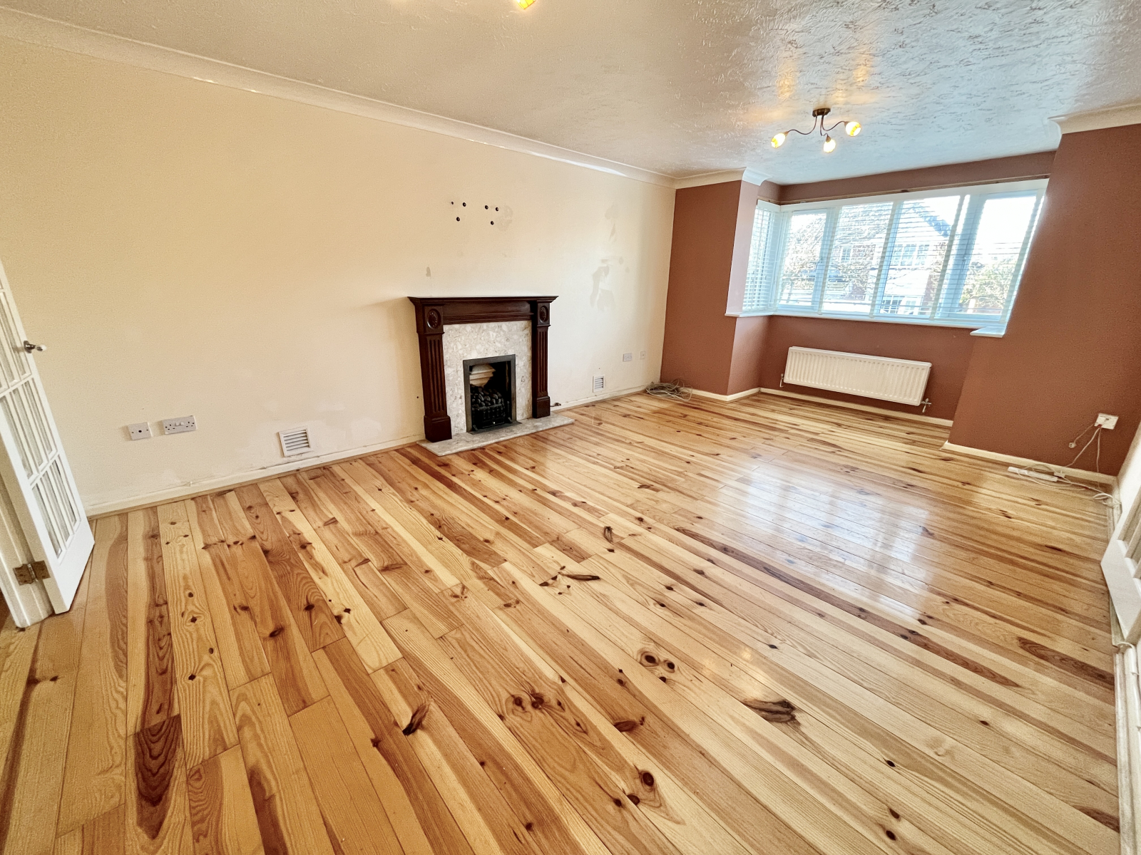 UPVC double-glazed patio doors give access to the rear garden and flood the room with light. Having solid wood flooring throughout and space for a large dining table. Modern central lighting, power points, and radiator.