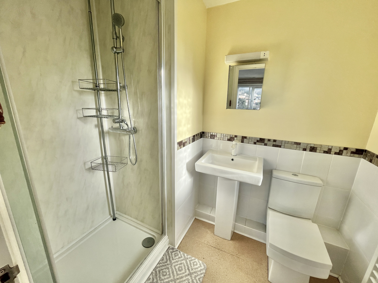 UPVC double-glazed window to side elevation. Modern white suite comprising of; Low-level push button W.C and pedestal wash hand basin with mixer tap, tiled splash backs, and mirror over with shaving light. Double step-in glazed shower cubicle with power shower having rainfall head and attachments. Aqua boarding and glazed door. Modern radiator and central lighting. Cork flooring and extractor fan.