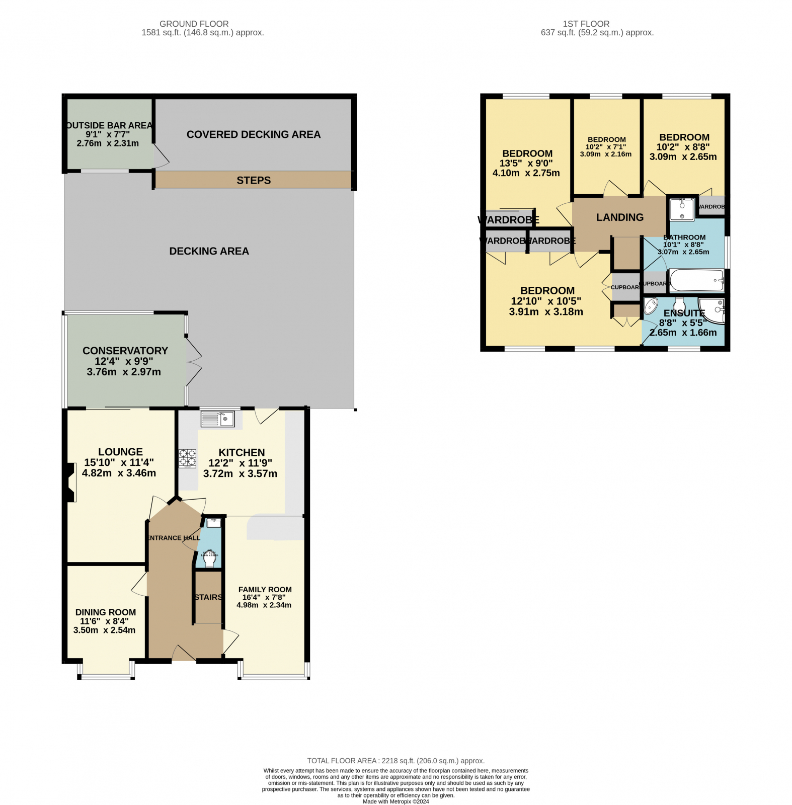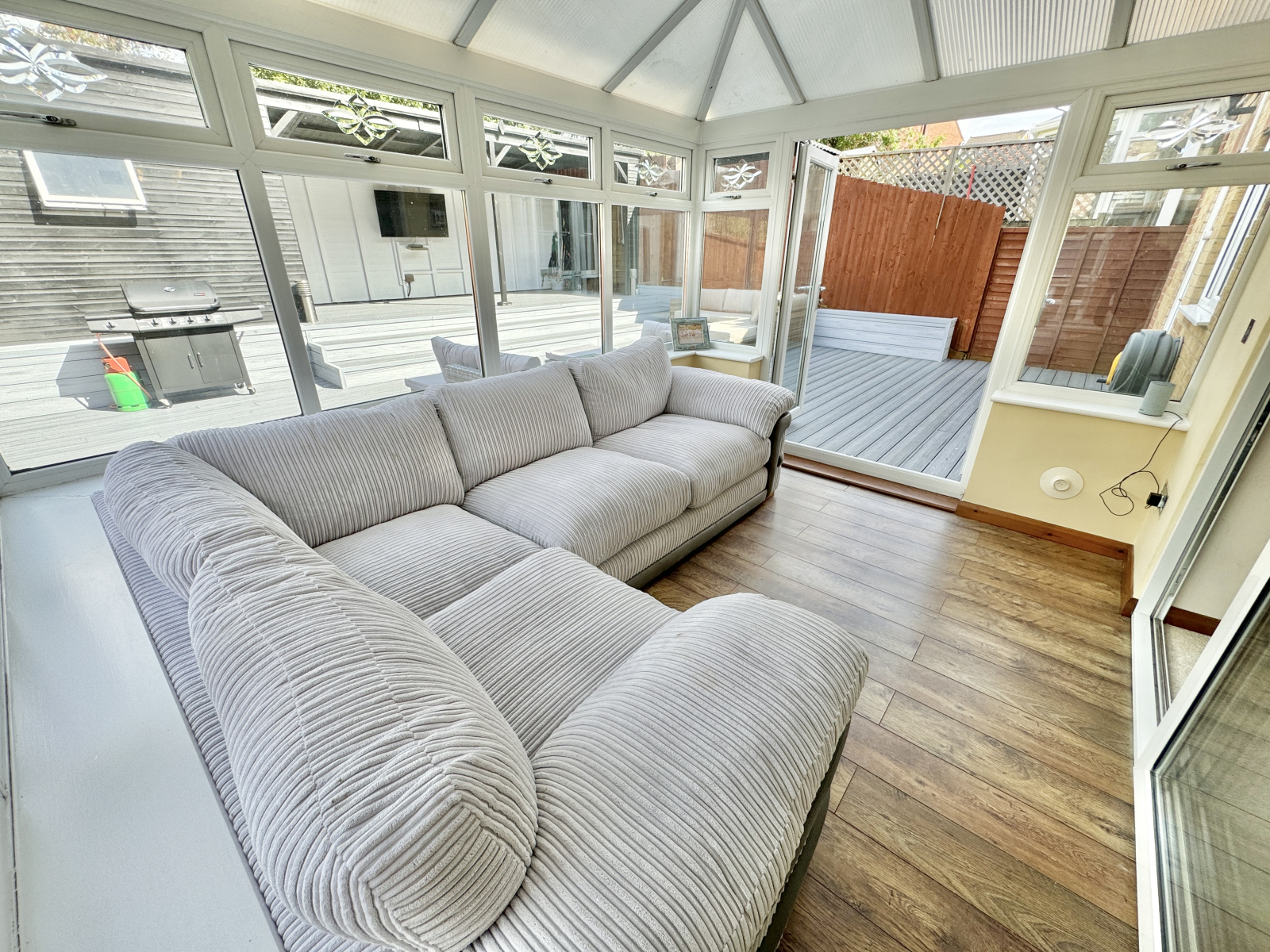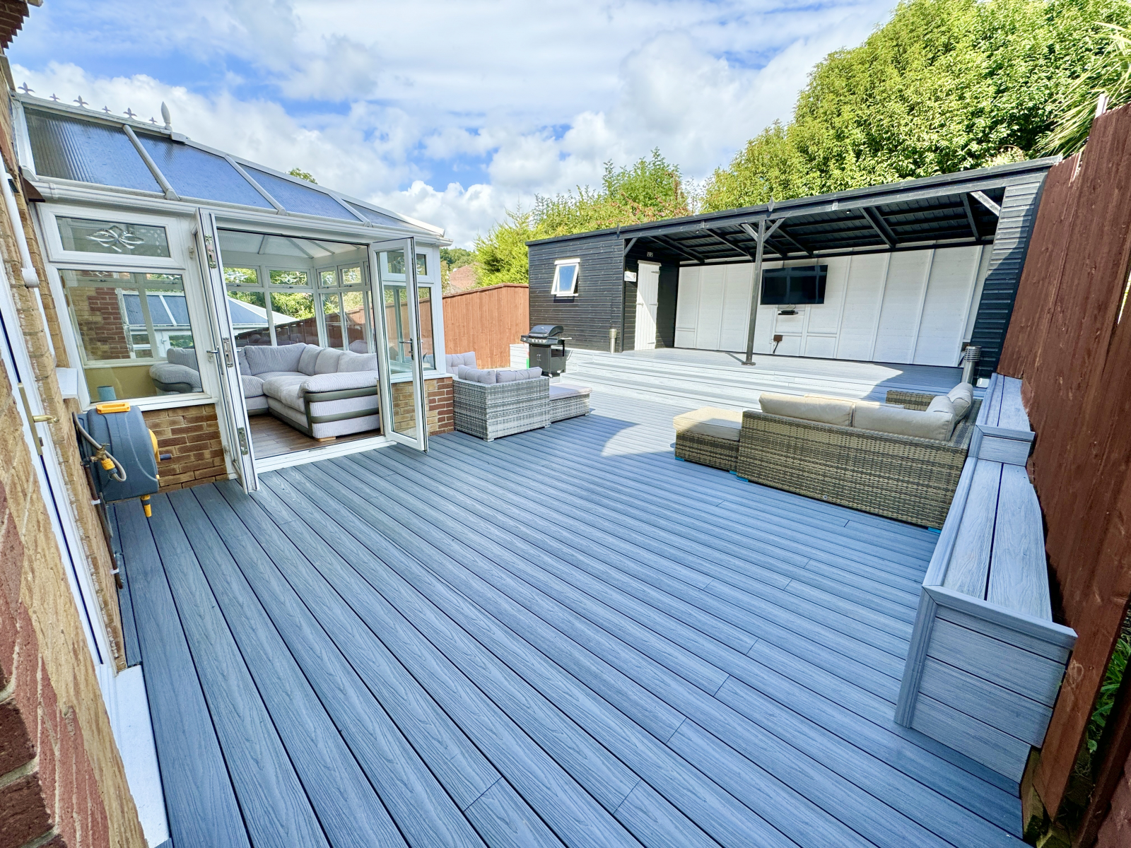 The large rear garden is predominantly laid with composite wooden-effect grey decking, creating a stylish and low-maintenance outdoor space. It includes a timber out-house currently utilized as a bar area with an additional undercover raised decking area and a separate shed to the side of the property.