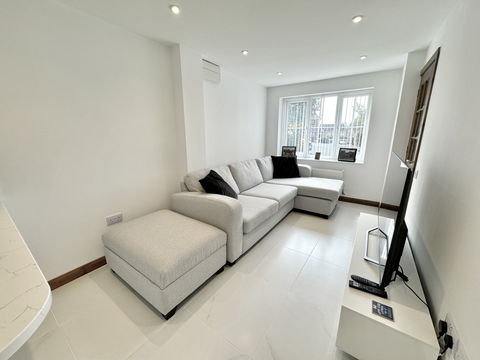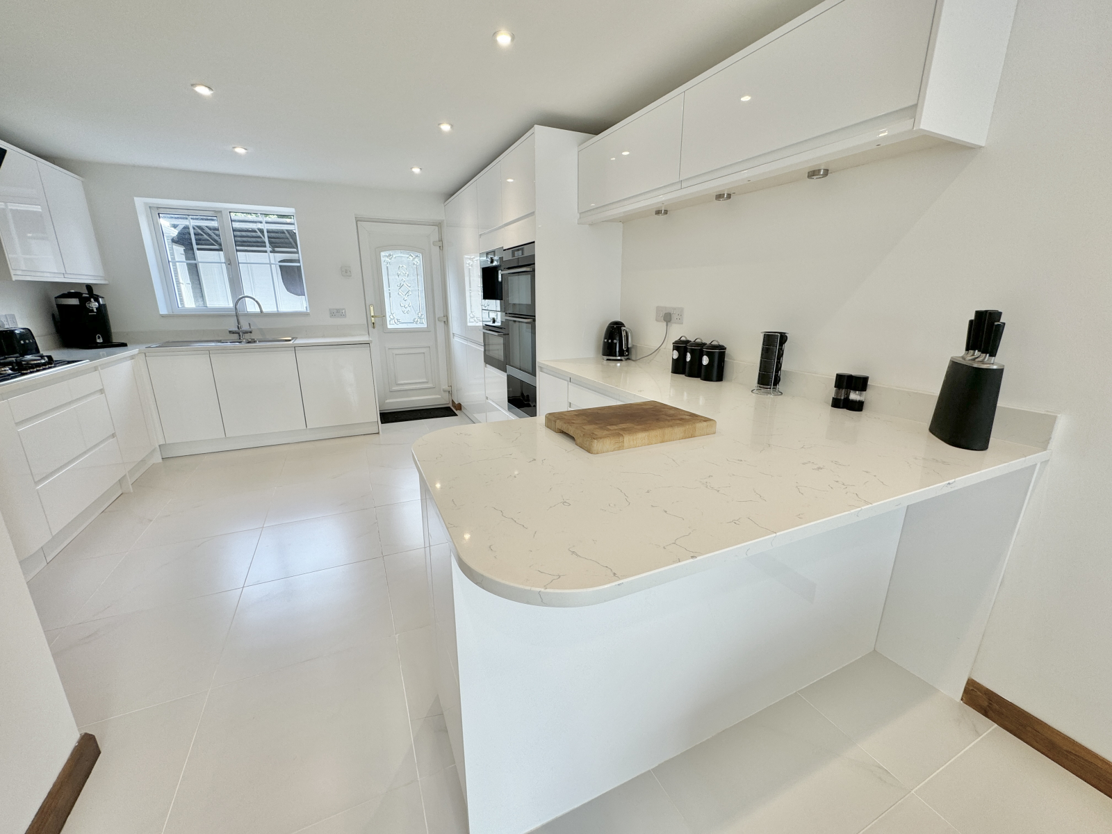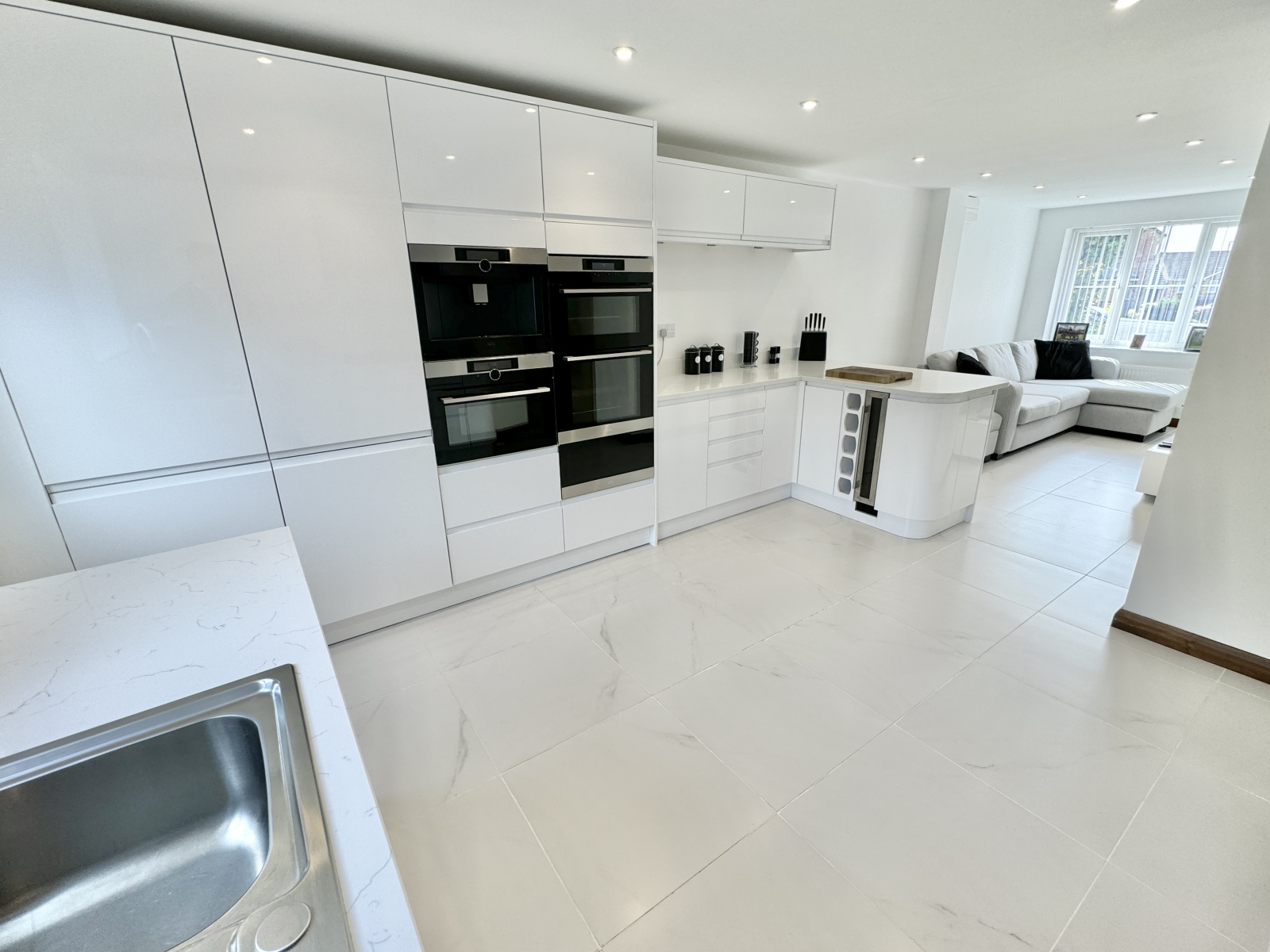This spacious area features large marble-effect tile flooring and a recently fitted kitchen with high-gloss white eye-level and base units. It includes double-glazed UPVC windows to both the front and rear aspects, and an obscured double-glazed UPVC door leading to the rear garden. High-end AEG appliances include a five-ring gas hob, a large modern black extractor fan, a 1.5 stainless steel drainer with a chrome-effect mixer tap, a built-in AEG coffee machine, an AEG double oven, an AEG plate warmer, an AEG microwave, a built-in large fridge freezer, a built-in wine cooler, and soft-close doors. The room is finished with spotlighting and power points.