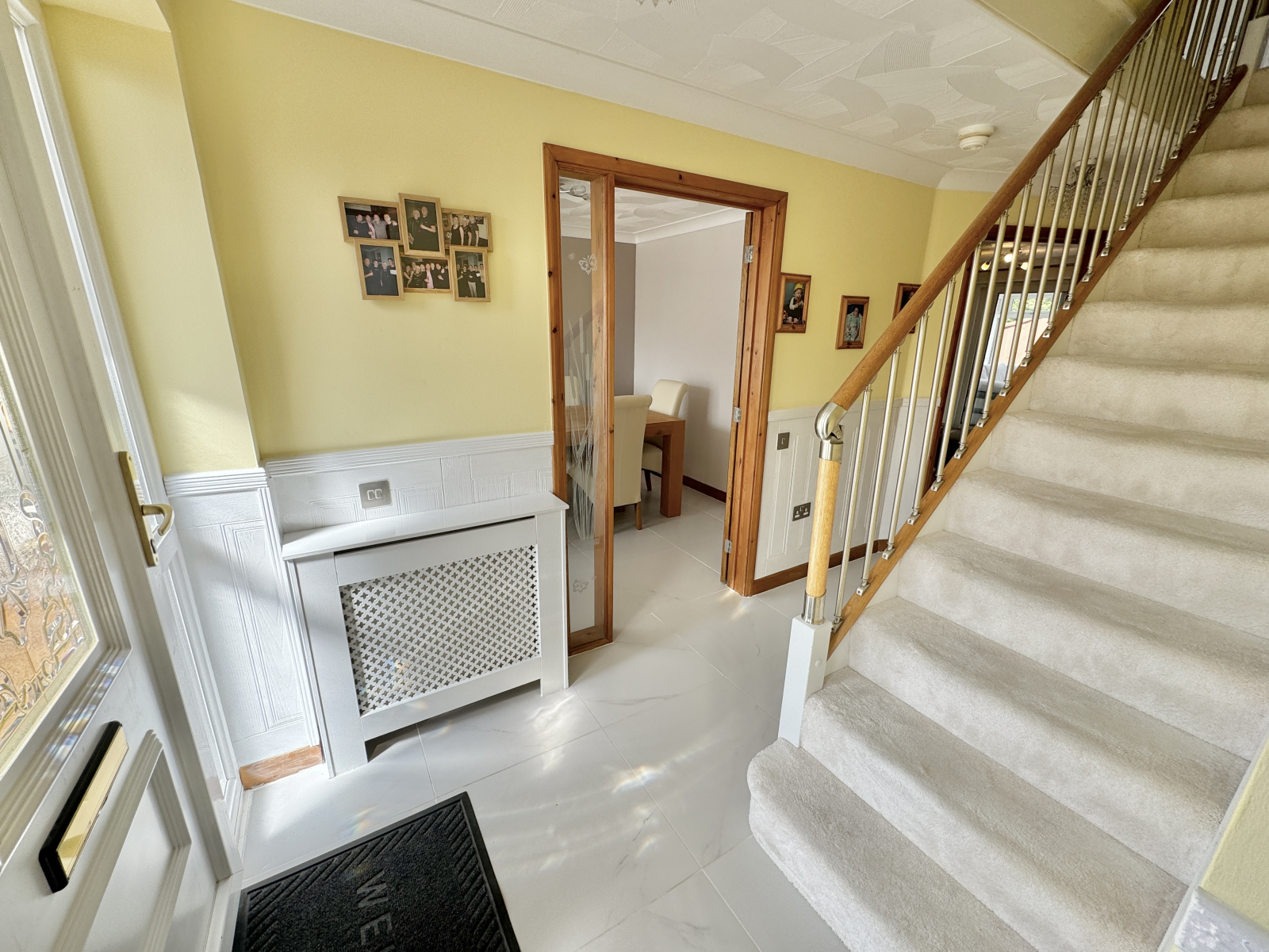 The entrance is via a partially double-glazed UPVC door that leads into a welcoming hallway, featuring large white marble tile flooring, light fittings, and a radiator. Chrome-effect switches and power points complete the modern look.