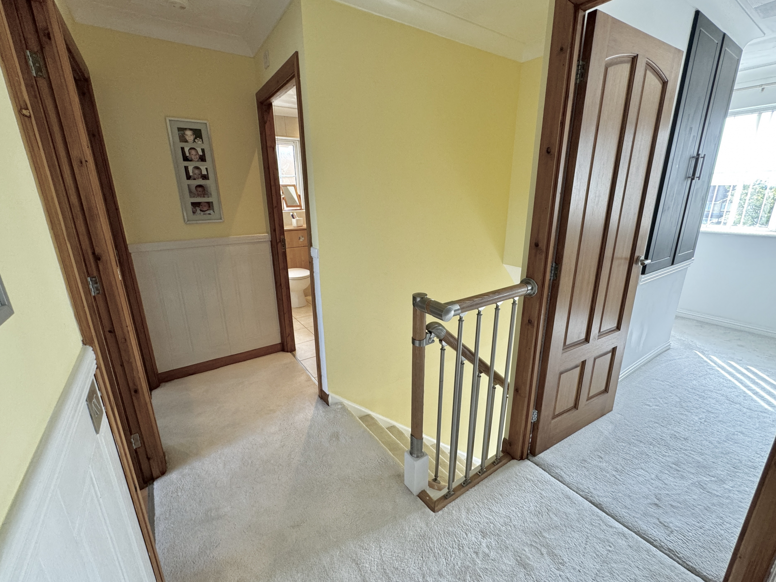 The staircase is fitted with a cream carpet, modern wooden and chrome-effect banister, and leads to a carpeted first-floor landing with loft access (light switch for the loft).
