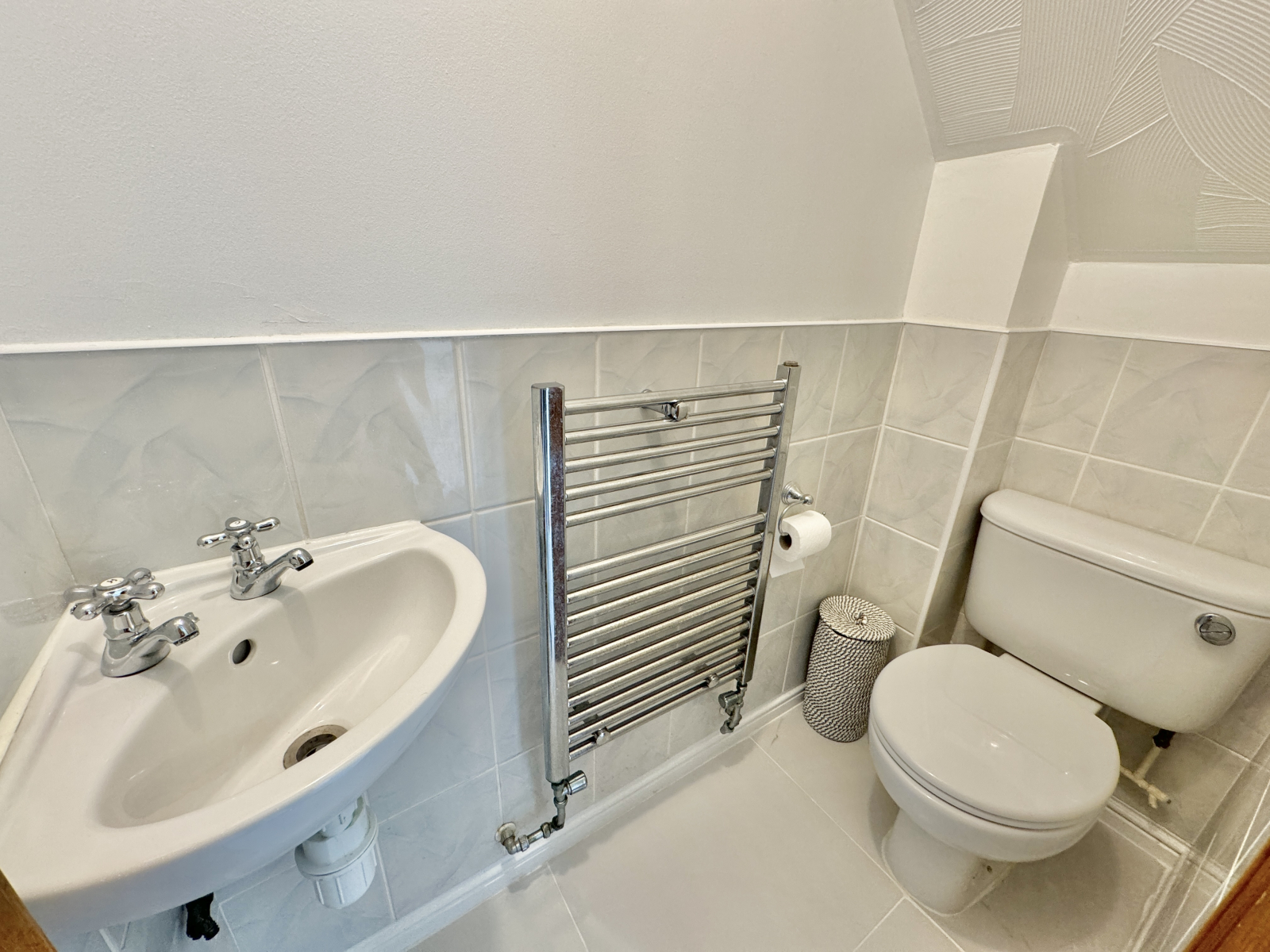 A two-piece white suite complete with a sink basin and low-level push-button W.C. Heated towel rail and light fitting.
