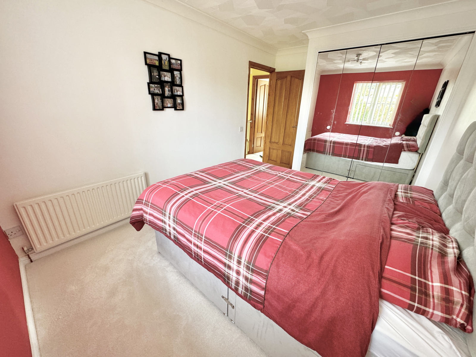 A double bedroom with a double-glazed UPVC window to the rear aspect, a single mirrored built-in wardrobe, a radiator, power points, and central lighting.