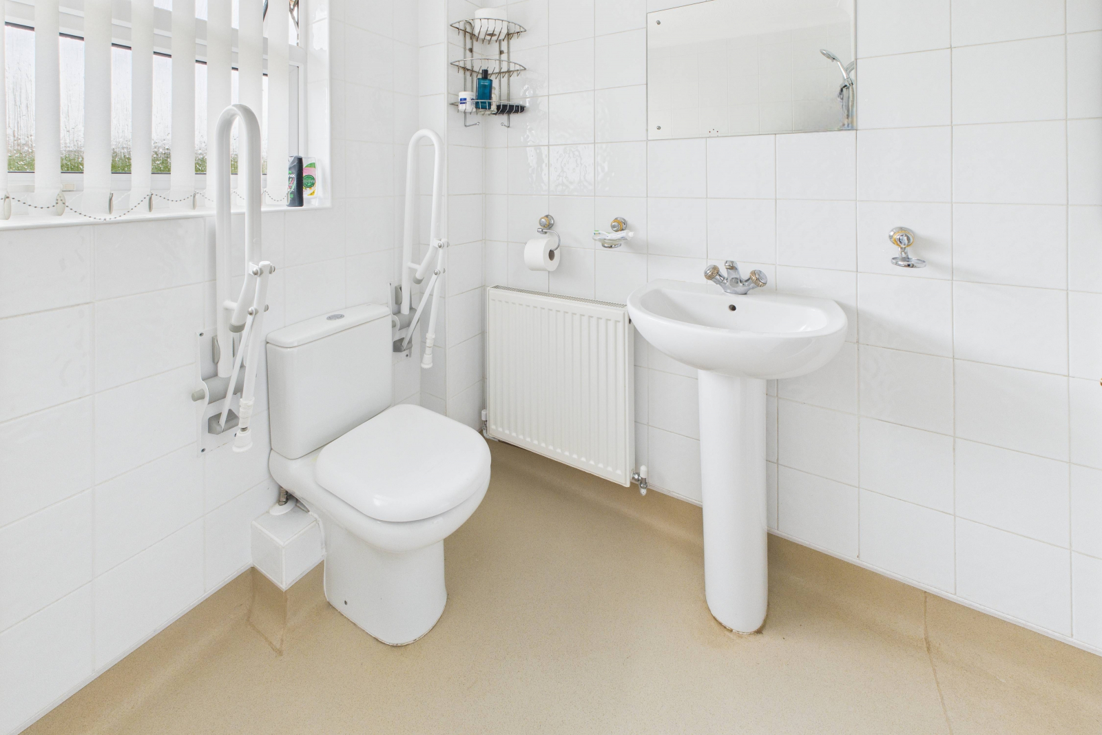 Vinyl flooring, UPVC obscure double-glazed window, low-level W.C. with dual push flush, pedestal wash hand basin with chrome mixer tap, radiator, overhead shower.